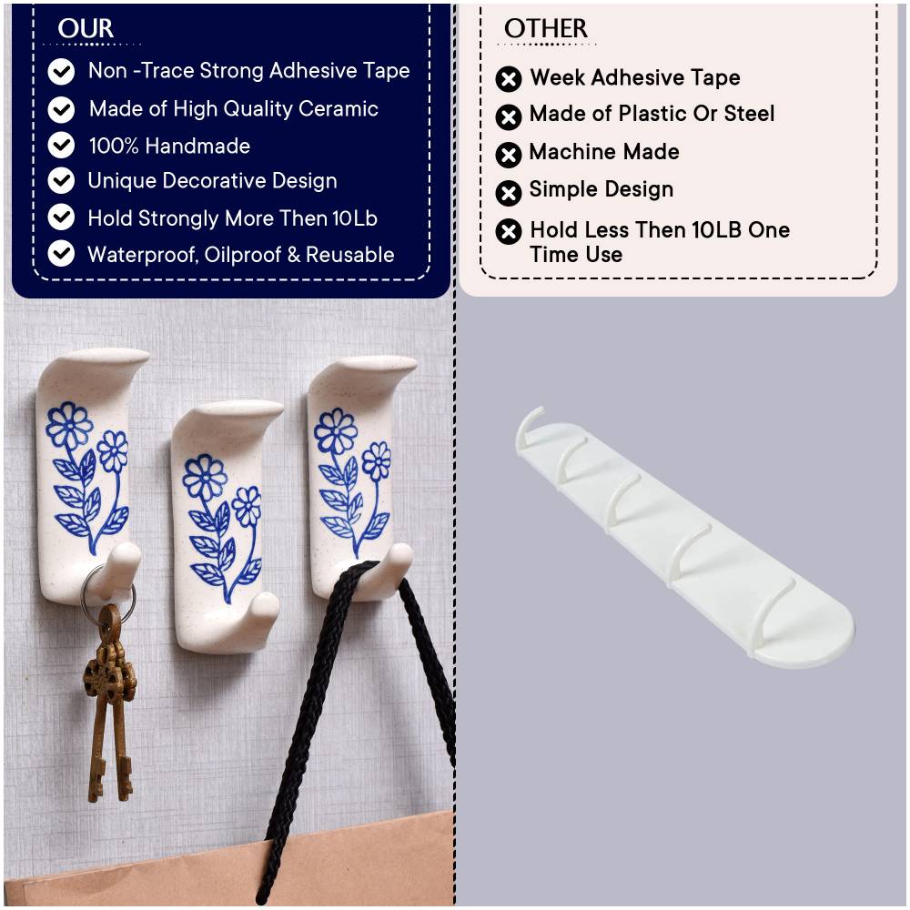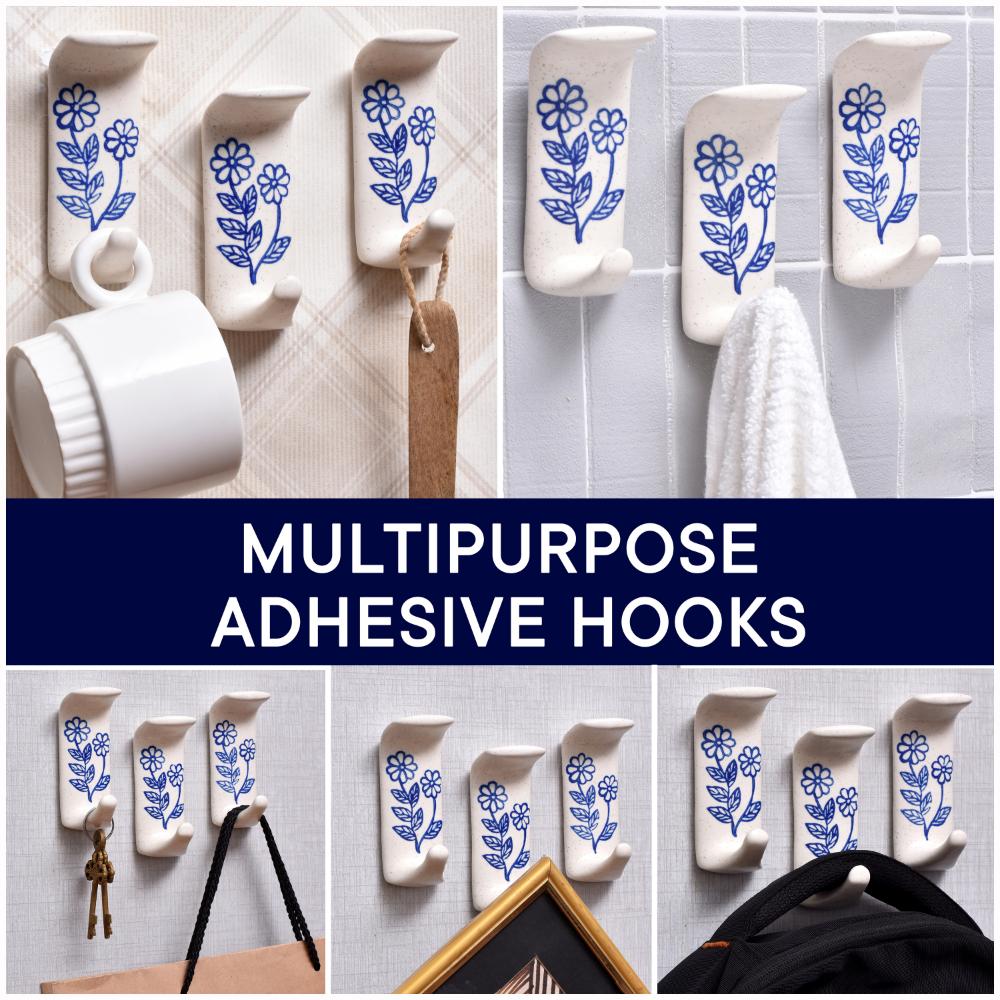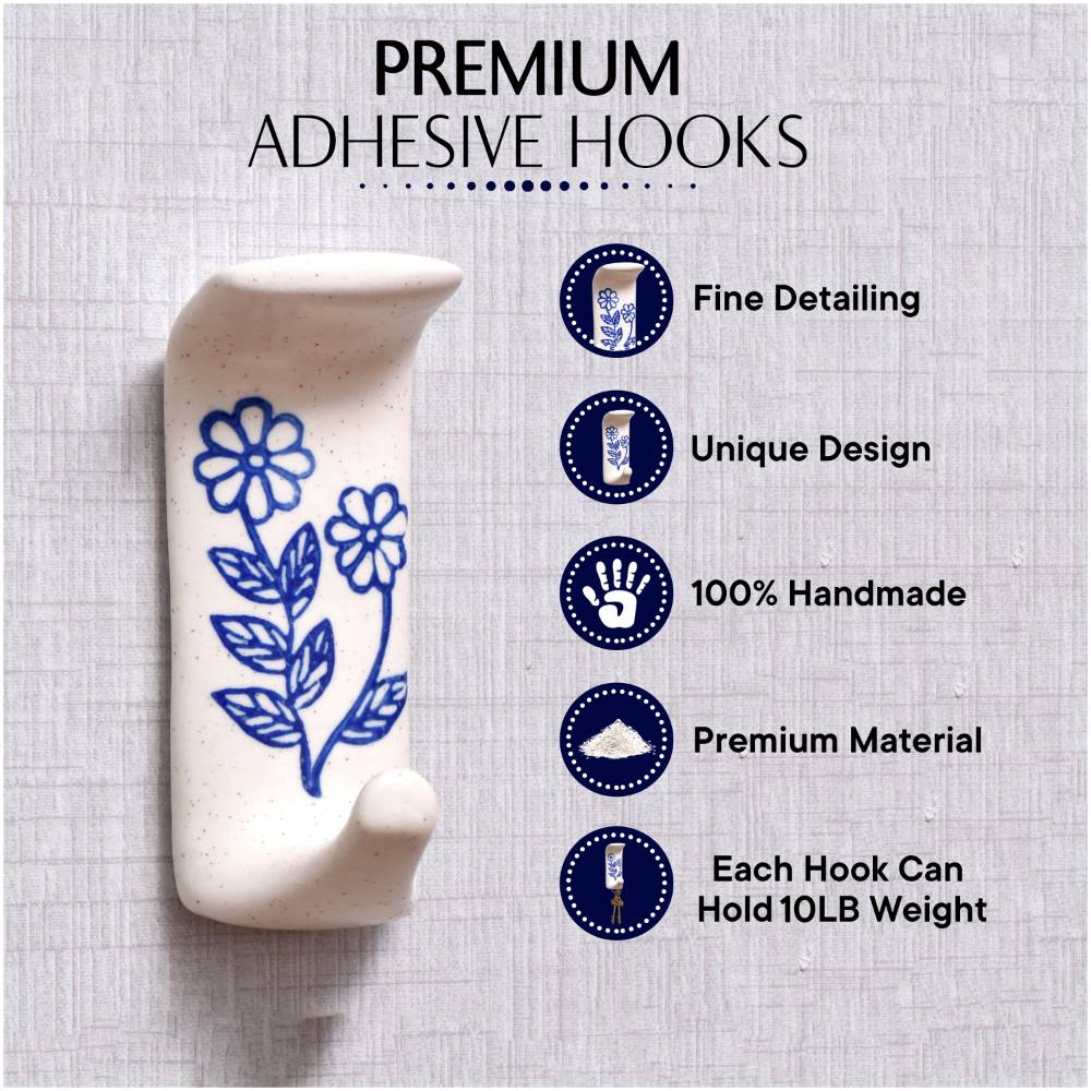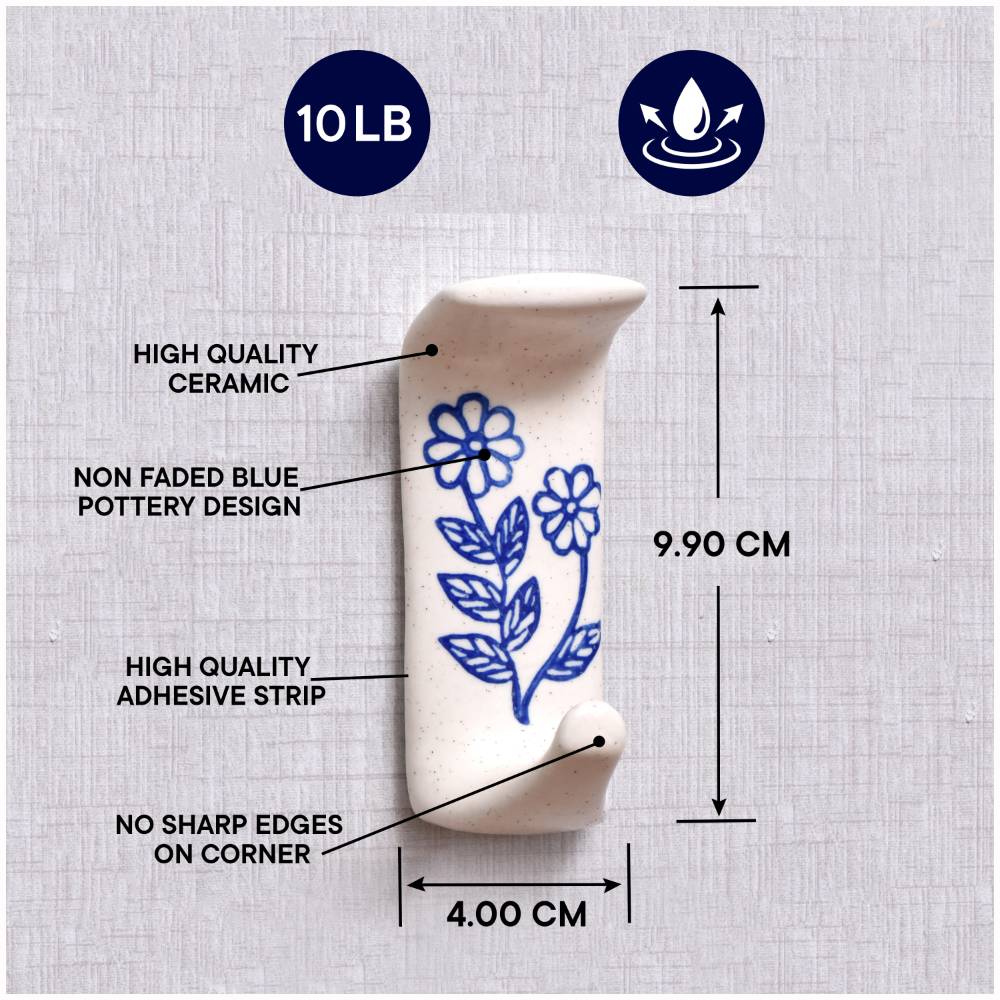 Enhance your home with the Ceramic Blue Flower No Drill Wall Hooks. Featuring a lovely blue flower pattern on smooth ceramic, these wall hooks are both stylish and functional. Thanks to their no-drill adhesive backing, installation is a breeze—no tools or hardware required—making them perfect for renters or anyone seeking a simple way to organize and beautify their space.