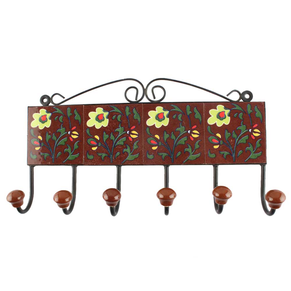 Ceramic Floral Tile Hook in Dark Brown. When Put on Wall or Cabinet It is An Art in Itself. The Metal Part of this Hook is Black Powder Coated.