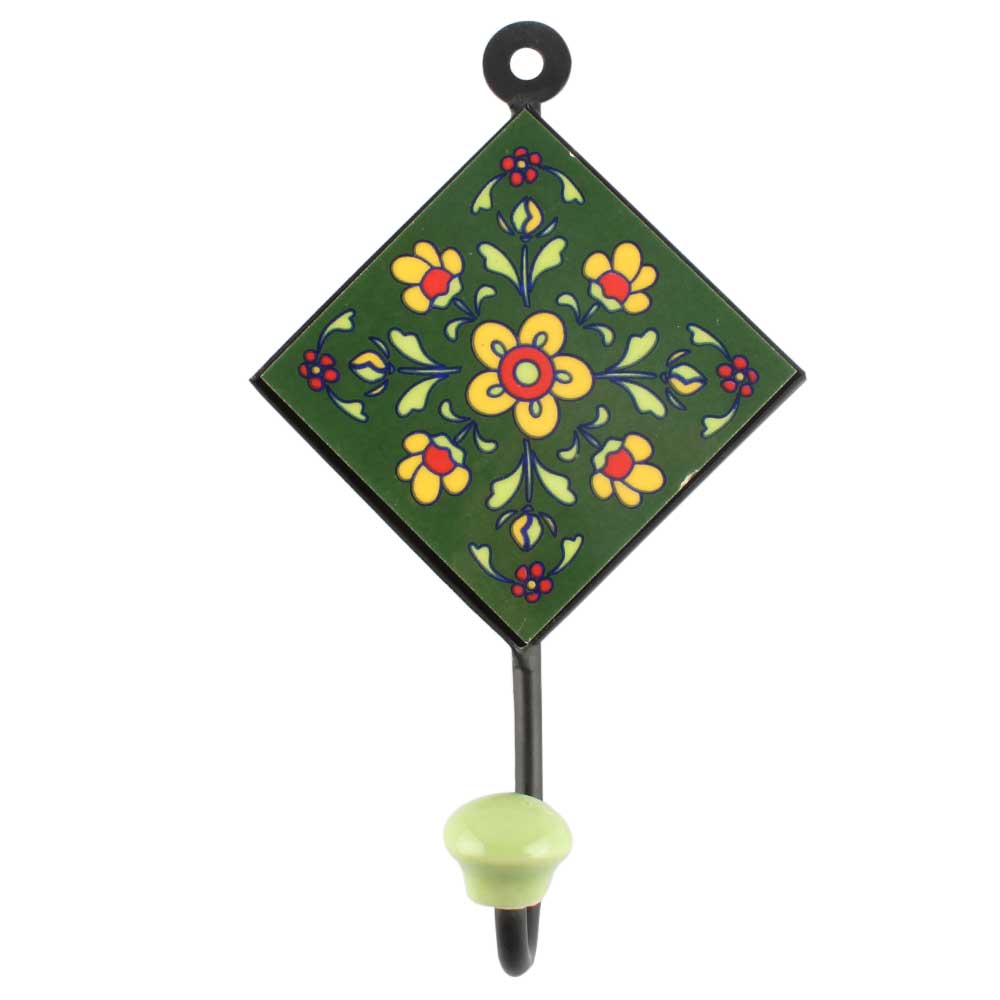 Ceramic Floral Tile Hook in Forest Green. When Put on Wall or Cabinet It is An Art in Itself. The Metal Part of this Hook is Black Powder Coated.