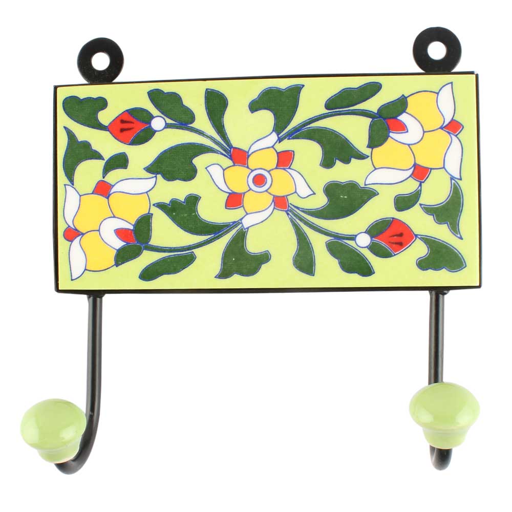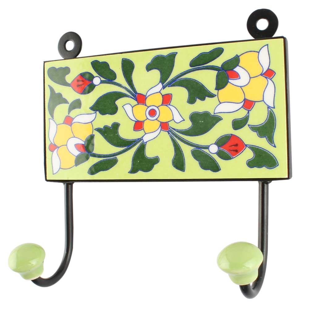 Ceramic Floral Tile Hook in Forest Green Leaf. When Put on Wall or Cabinet It is An Art in Itself. The Metal Part of this Hook is Black Powder Coated.