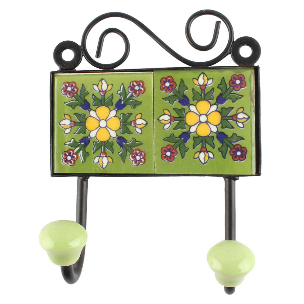 Ceramic floral Tile Hook in Pea Green. When Put on Wall or Cabinet It is An Art in Itself. The Metal Part of this Hook is Black Powder Coated.