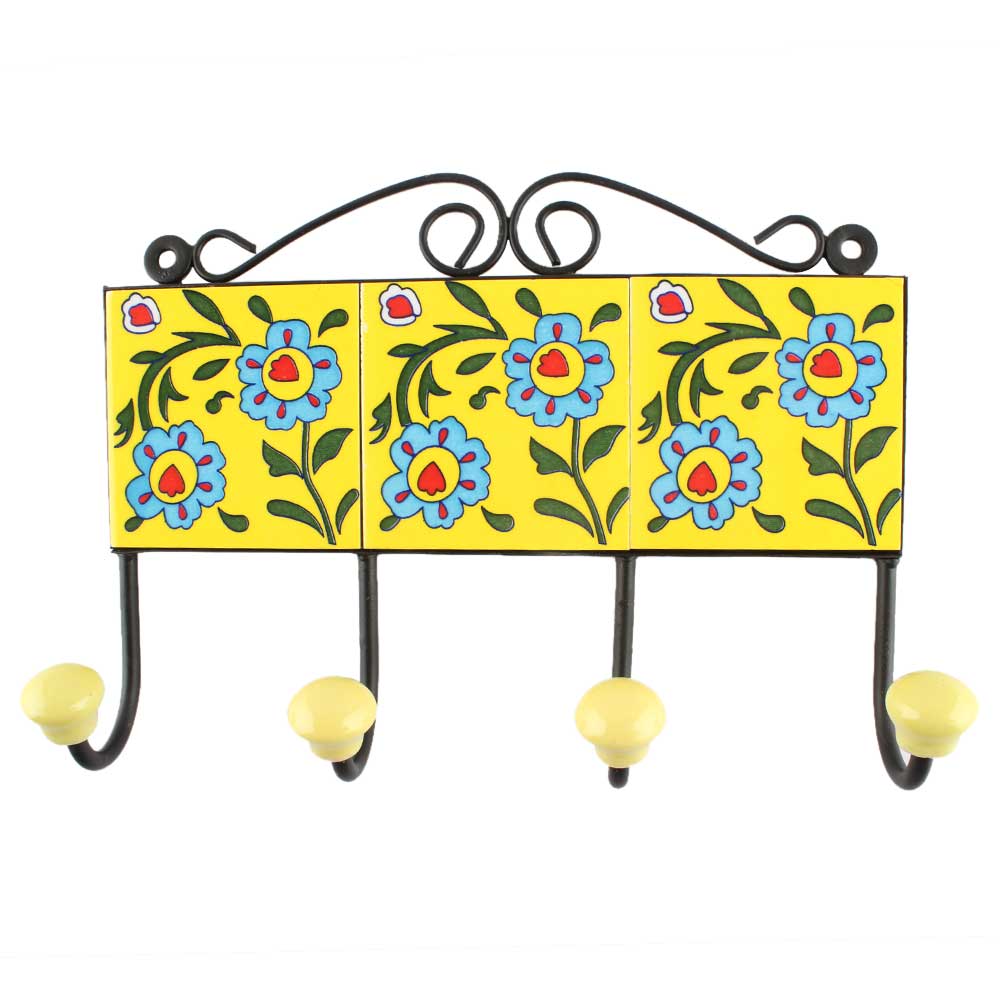 Ceramic Floral Tile Hook in Yellow. When Put on Wall or Cabinet It is An Art in Itself. The Metal Part of this Hook is Black Powder Coated.