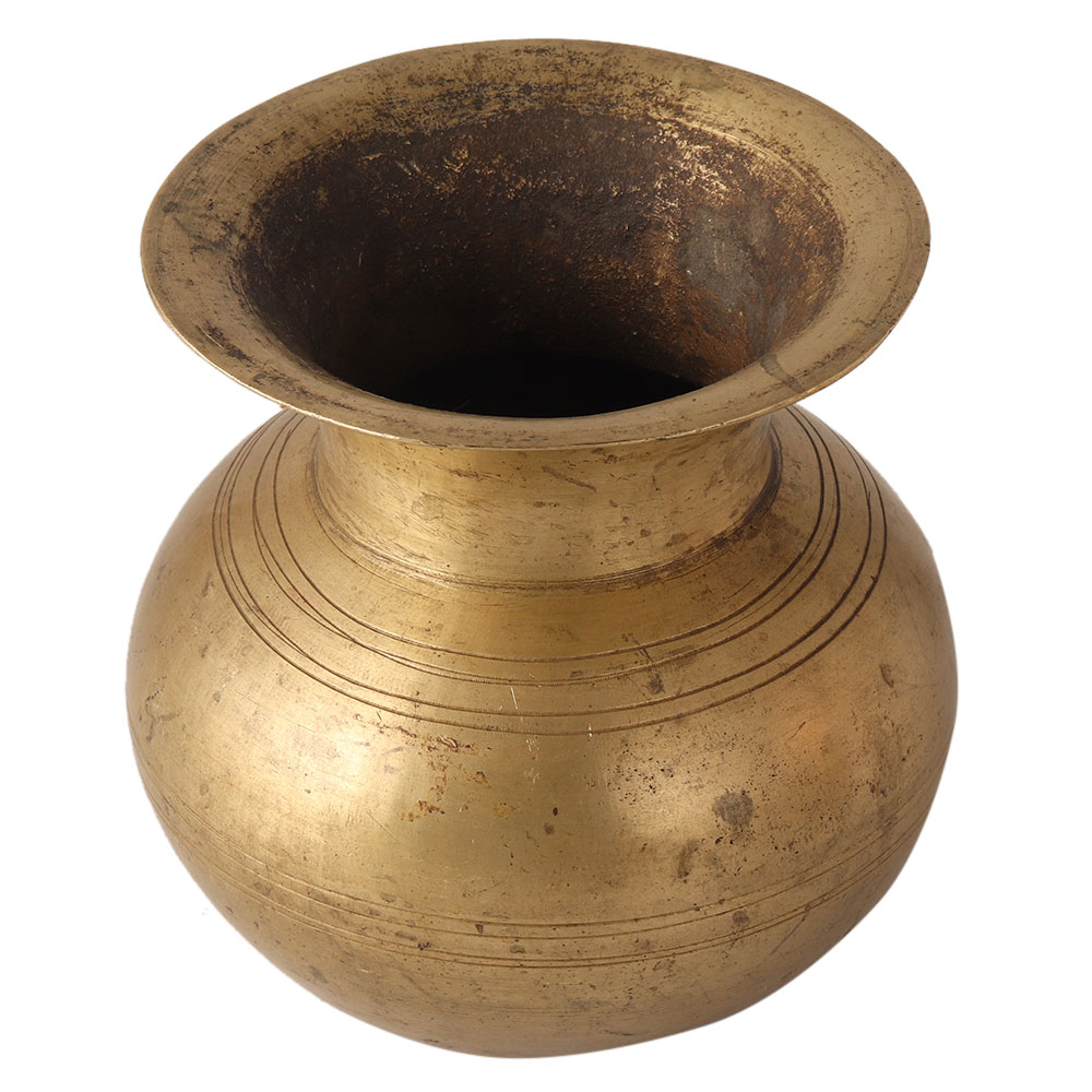 This vintage Gangajal water lota or pot has a large opening. It has a charming look with matte brass finish. Use this vessel as a flower pot for your home or office.