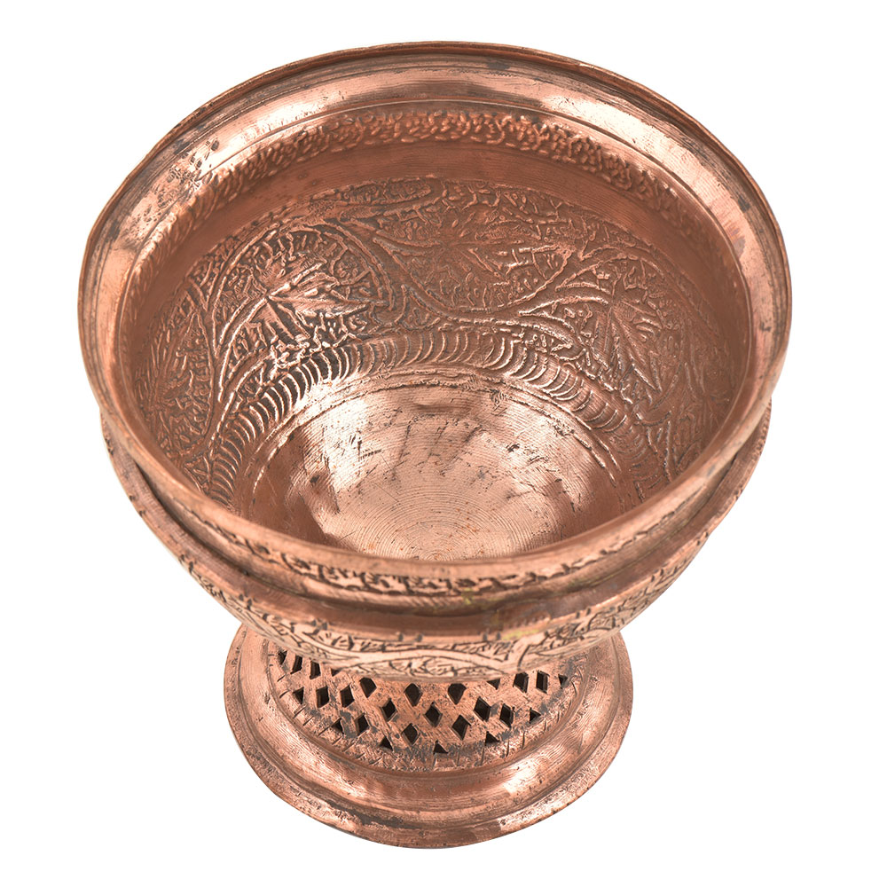 Spruce up and bring grace to your kitchen by the fine addition of this chinar carved Kashmiri copper bowl. With a simple circular handleless contour, it can be used for serving nuts and dry fruits or any delicacy of your choice.