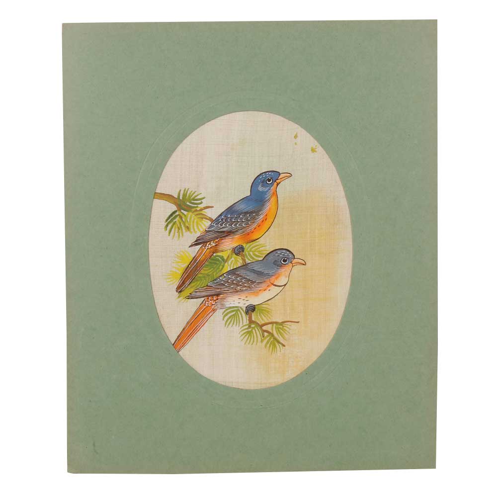 A beautiful hand painted portrait / painting on Art silk. Colorful picture of sparrows in sitting position on leafy branch of trees portrait painted in glowing acrylic and vegetable water colors. The colors extracted from certain minerals and plant sources.