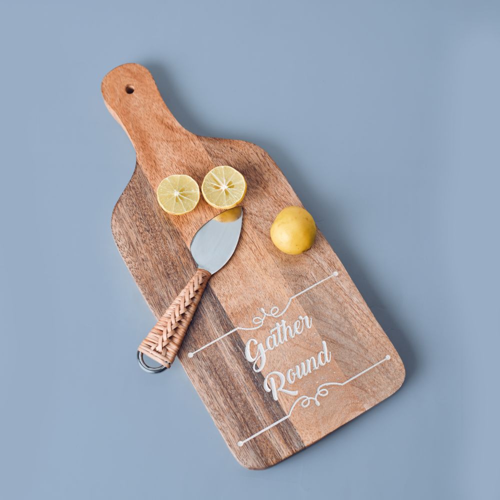 Wooden chopping board provides a workspace for cutting meat, slicing fruit, and heavy-duty vegetable cutting. High-quality wood resists warping and scarring from knives. Excellent for dicing, cutting, chopping, and serving food. These may be utilised while cooking on the kitchen counter. Cutting boards made of hardwood are customary and are kind to blades. Natural Wood, Unpolished, Uncolored, with No Additional Stains or Dyeing. Your costly blades won't go dull due to the fibres in wood. Use a wooden cutting board to quickly and comfortably chop vegetables, fruits, fish, meat, cheese, and other meals. It has a handy handle, making it a perfect complement to the kitchen.