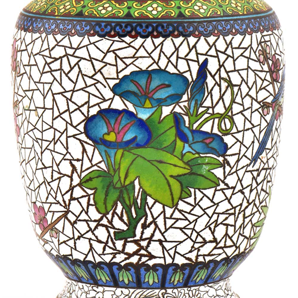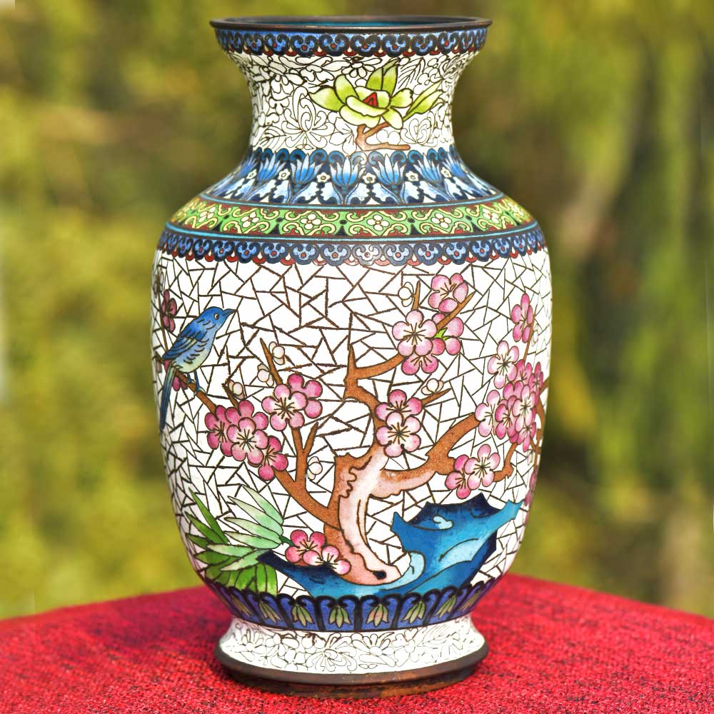 Decorative enameled metal ware called cloisonné exhibit almost superhuman skill by master craftsmen displayed by the marvelous diversity, intricacy and beauty of their designs. Earliest decorative motifs include cloud patterns, lotus flowers, the symbol of purity and beauty later motifs included dragons amid clouds, floral landscapes, scenes from court and mystical animals. Exquisitely detailed petals and leaves with fine color gradations. Fine inlaid wirework at neck and base, which are edged in brass. Exquisitely detailed petals and leaves with fine color gradations. Dark cobalt blue ground with white, rust, orange, yellow, and mauve blossoms; foliage in shades of green edged in rust are some of the popular designs of cloisonné.