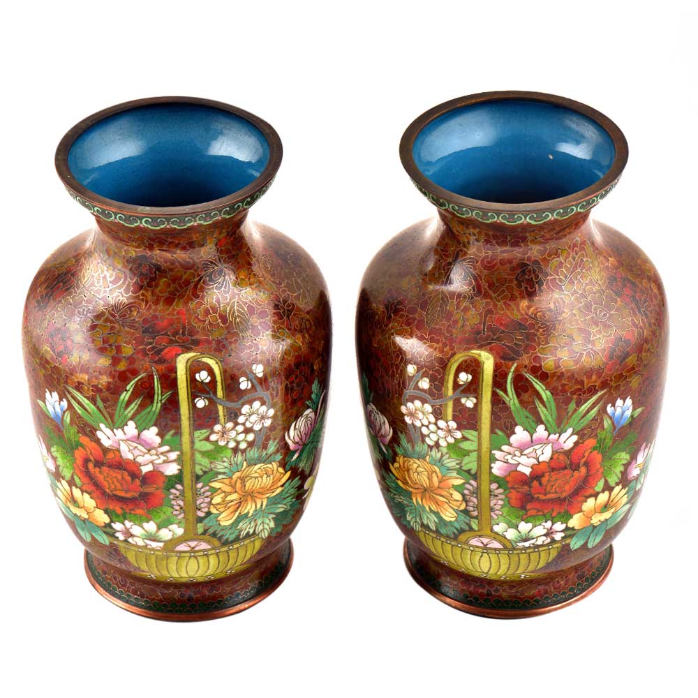Decorative enameled metal ware called cloisonné exhibit almost superhuman skill by master craftsmen displayed by the marvelous diversity, intricacy and beauty of their designs. Earliest decorative motifs include cloud patterns, lotus flowers, the symbol of purity and beauty later motifs included dragons amid clouds, floral landscapes, scenes from court and mystical animals. Exquisitely detailed petals and leaves with fine color gradations. Fine inlaid wirework at neck and base, which are edged in brass. Exquisitely detailed petals and leaves with fine color gradations. Dark cobalt blue ground with white, rust, orange, yellow, and mauve blossoms; foliage in shades of green edged in rust are some of the popular designs of cloisonné