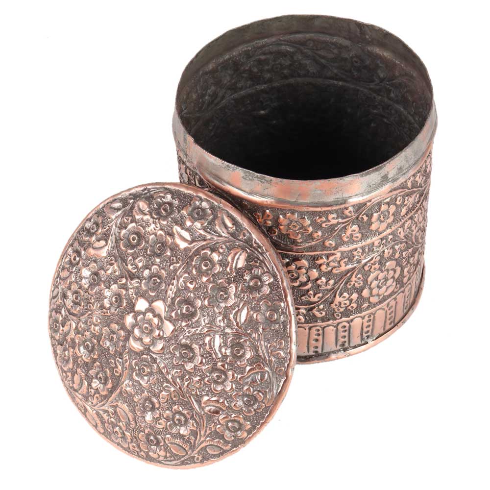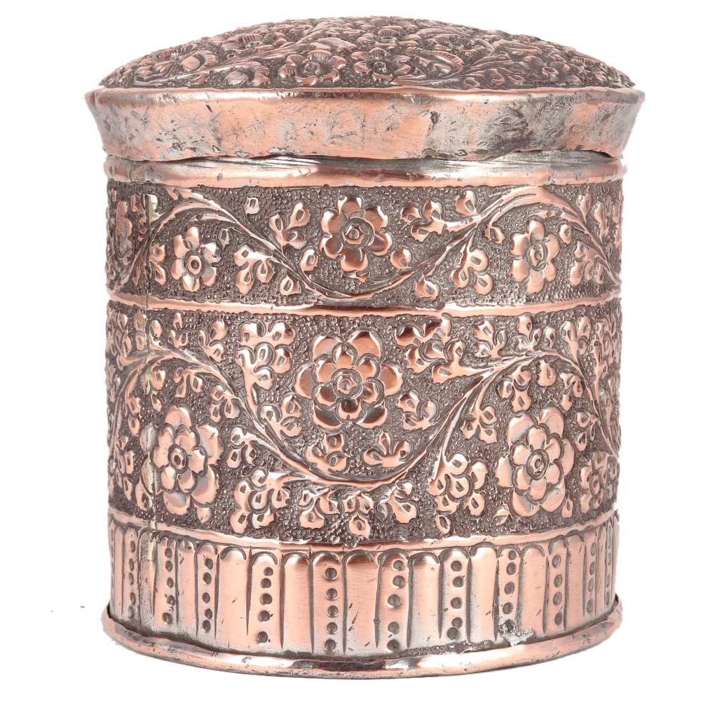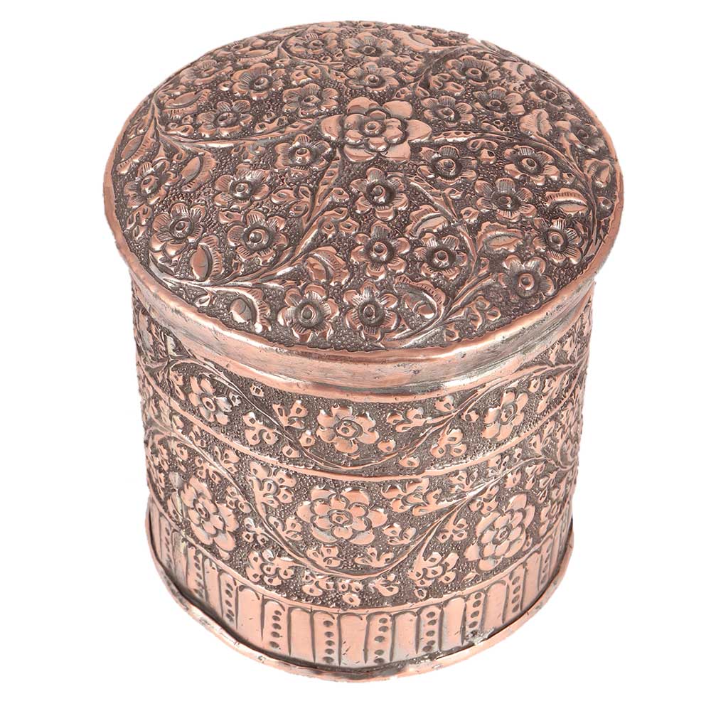 Because of its elaborate repousse and Jali work design on the box and lid, this hand - crafted classic round Pattern copper storage box has a simple, traditional look that will add a touch of class to any set of decor. It also has a removable lid to keep your belongings safe and protected.
