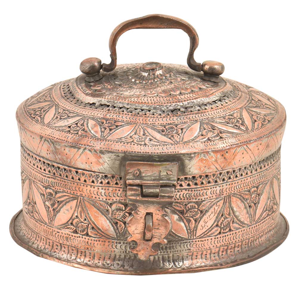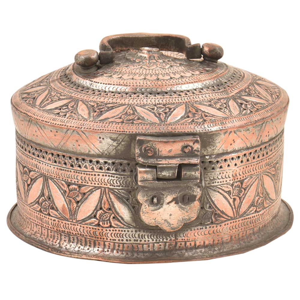 Hand Embossed Copper Betel Nut Pandan Box – with hand hammered floral and incised decoration used to store betel leaf, lime, tobacco and the nut from the areca palm. The practice of chewing betel nut was popular all over Asia and is still a common practice in Myanmar and India. This Pandan betel nut box contains six small pots, each incised on the tops and sides with the same design and metal.