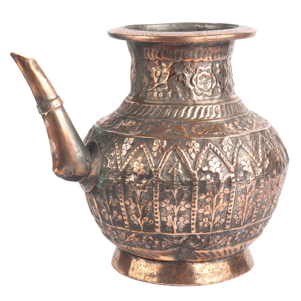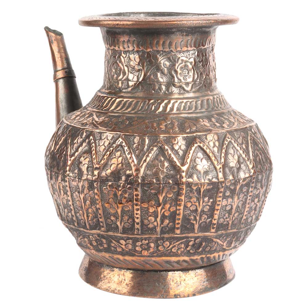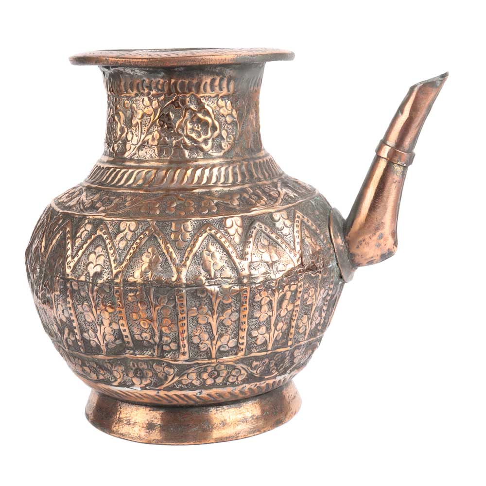 Copper Floral Engraved Islamic Style Holy Water pot the design covering almost every area of the pot including the stout, but excepting the foot. The design is similar to indo Persian design with lots of flowers and leaves . Wedding gift, Christmas gift and ideal collectors item.