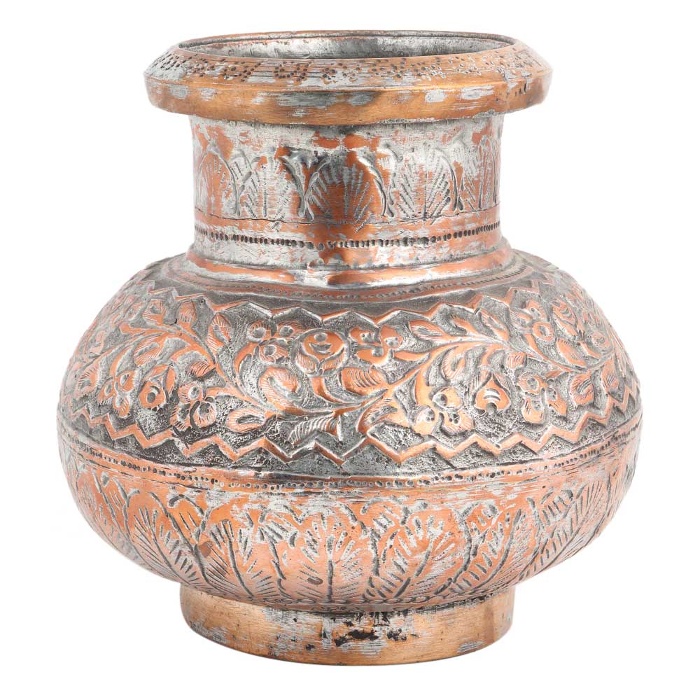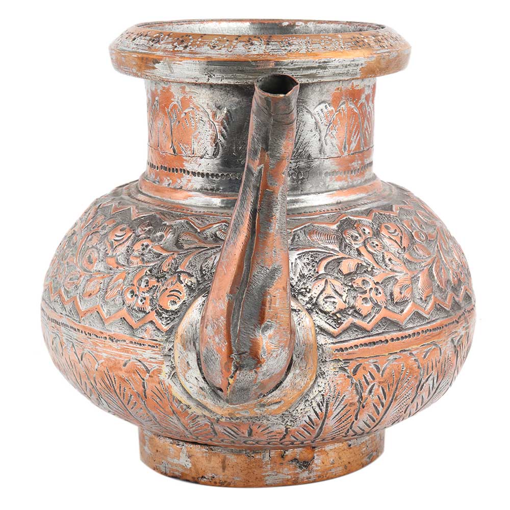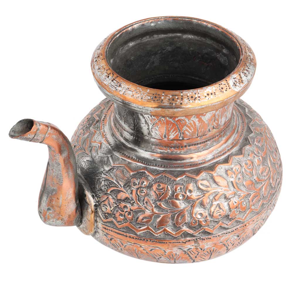 This is a traditional copper kettle tea pot with carved design and a spout to pour the liquid from the kettle or tea pot, kitchen decoration, Dining table decoration, showpiece, wedding gift, anniversary gift, housewarming gift.