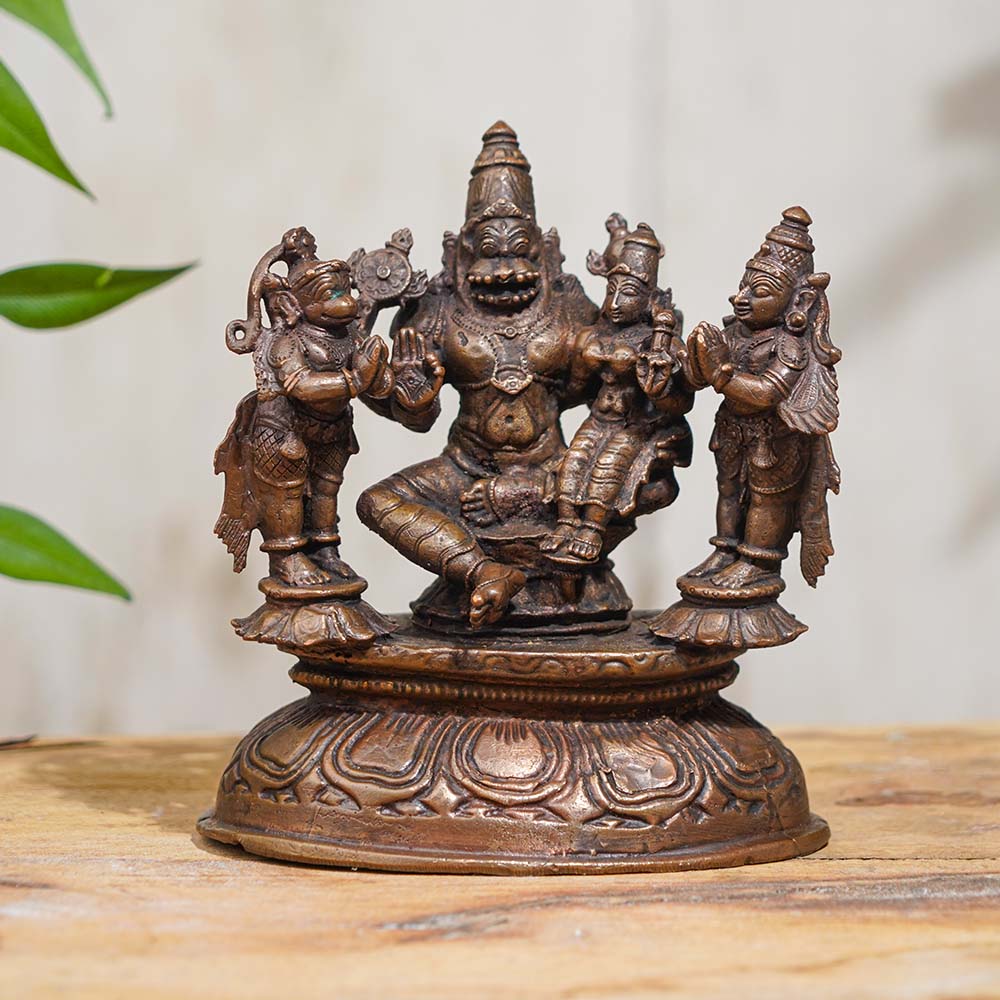 Bring the strength and beauty of the masterfully crafted Lakshmi Narasimha with Hanuman and Garuda brass statue into your home. Lord Vishnu is a major divinity in Hinduism and Hindu mythology. He is recognised as a lover of harmony and cosmic justice, and he resolves conflicts between god and humanity. The Hindu trio, also known as Trimurti, or the holy trinity of gods who represent the three stages of cosmic growth, consists of Vishnu, Brahma, and Shiva. Lord Vishnu statues are believed to provide patience, wisdom, prosperity, and prosperity to the house or workplace where they are placed.