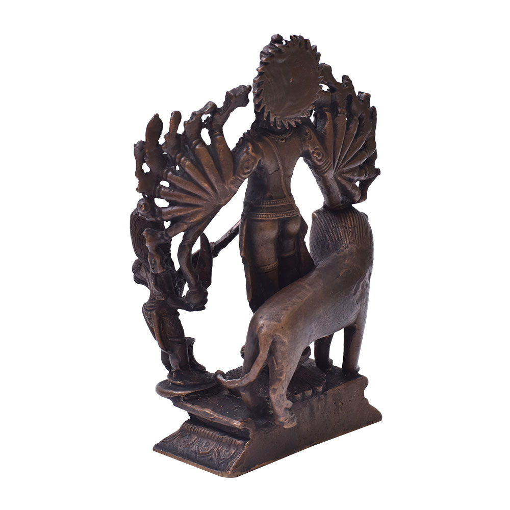 The copper statue of Goddess Durga killing Mahishasur is a stunning depiction of the Hindu goddess amid a mighty battle. The figure portrays Durga as a fierce warrior goddess, slaying the demon Mahishasur with her many weapons and powerful stance. The statue is made of high-quality copper and stands tall. The intricate details of the statue are meticulously crafted, with each element of Durga's outfit and weapons carefully designed to reflect her strength and power. Her many arms are shown holding various weapons, including a sword, a trident, and a bow and arrow, all directed towards the defeated demon at her feet. One of the most striking elements of the statue is Durga's expression. She is shown with a fierce and determined look, reflecting her strength and determination in battle. Her pose is also powerful and commanding, with her weapon on the demon's chest symbolizing her victory over evil. The statue is also highly symbolic, with each element of Durga's appearance representing different aspects of her character and story. For example, her many arms symbolize her ability to accomplish many things simultaneously, while her weapons symbolize her power and determination in battle. Durga is one of the most important deities in Hinduism and is often seen as a protector of the universe and of her followers. She is revered for her strength, courage, and determination, symbolizing female empowerment and resilience. This copper statue in a dark finish captures all of these elements beautifully and powerfully, making it a perfect addition to any collection or shrine. Overall, the copper statue of Goddess Durga killing Mahishasur is a stunning representation of one of the most influential figures in Hindu mythology. It is a powerful and inspiring symbol of strength, courage, and determination and will inspire and awe all who see it.