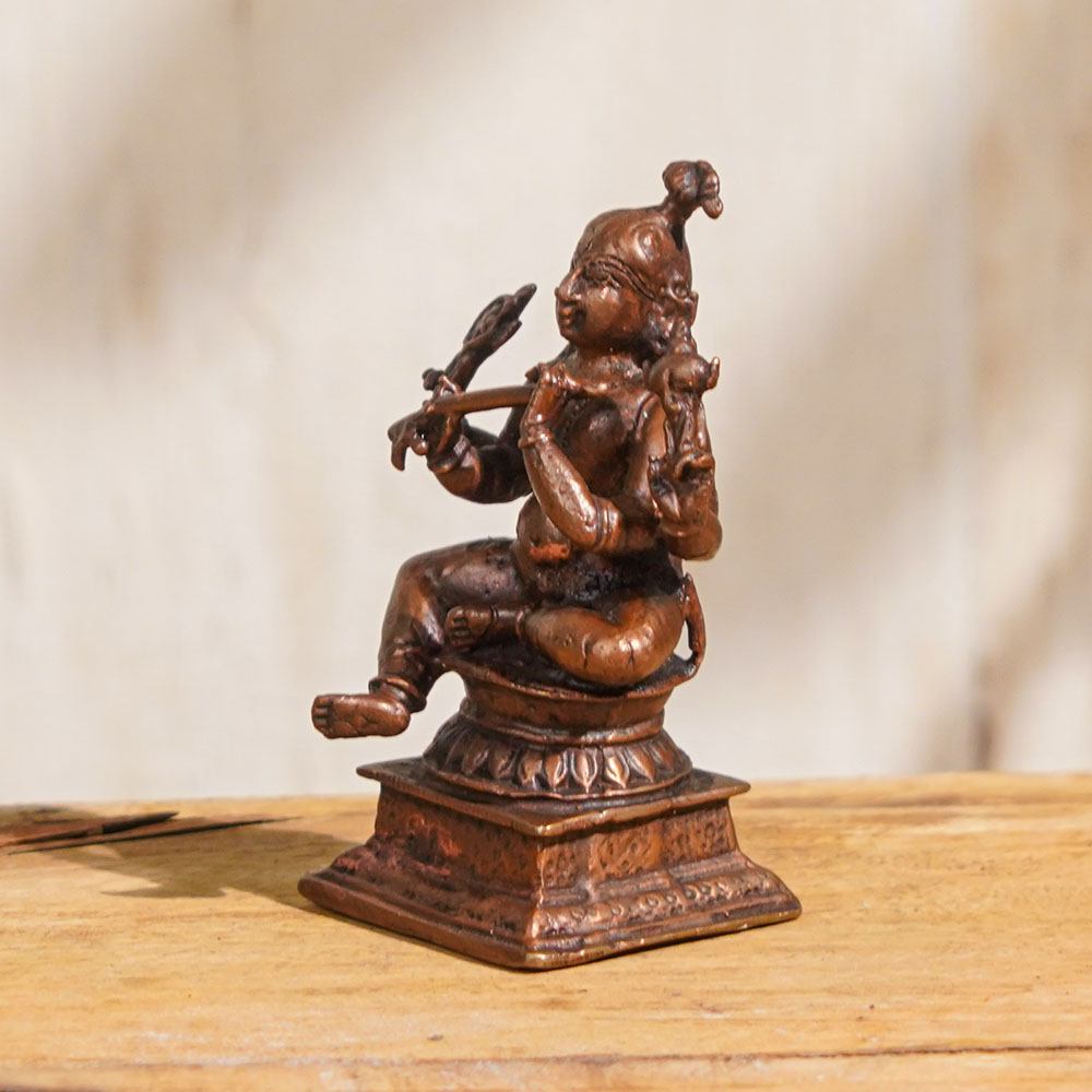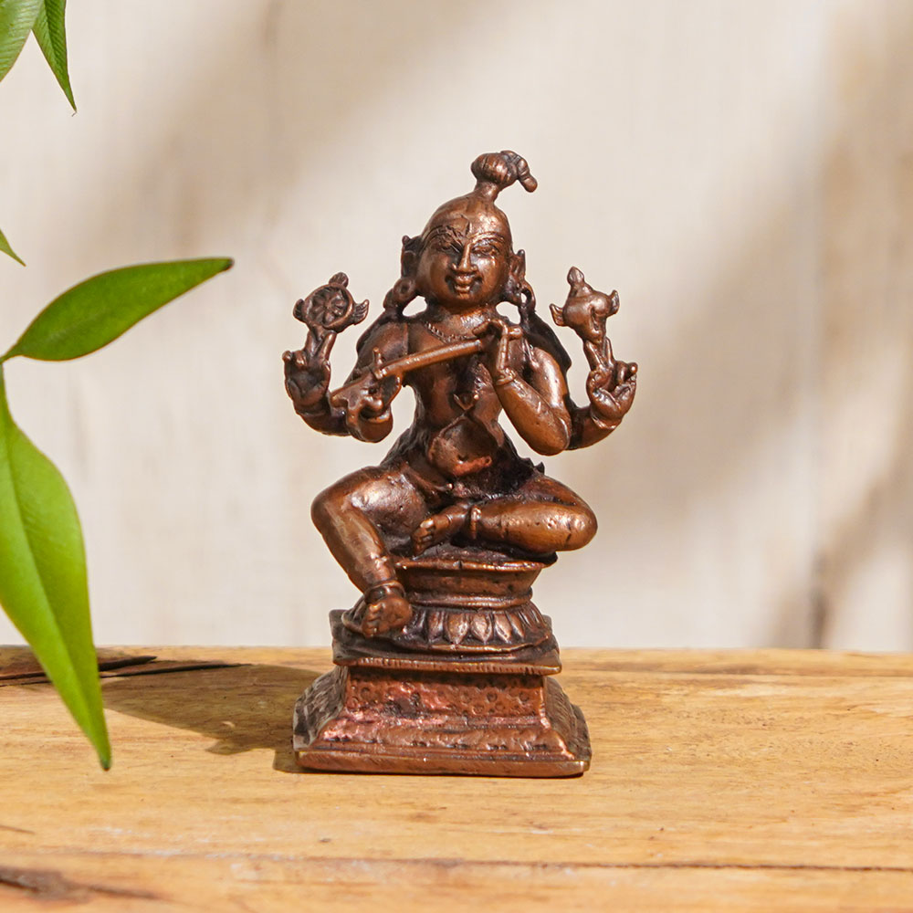 A copper statue of Lord Krishna playing flute which is one of his key defining features. In this intricately carved statue it is how Kanha is sitting on a lotus platform with his legs crossed and with a murli in his hands.