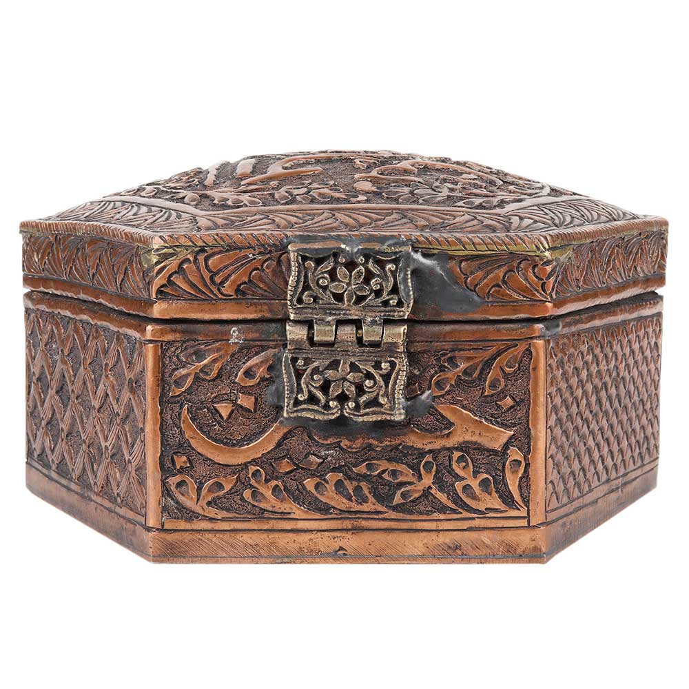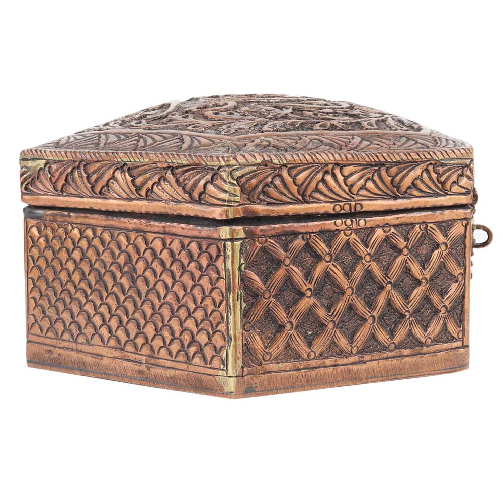 This lovely box appears to be made of copper. It has a beautiful embossed pattern on the entire surface of the box .It has a hinged lid and a latched closure. Store your valuables, jewelery and important documents in this box. It is an ideal gifting option for friends and relatives.