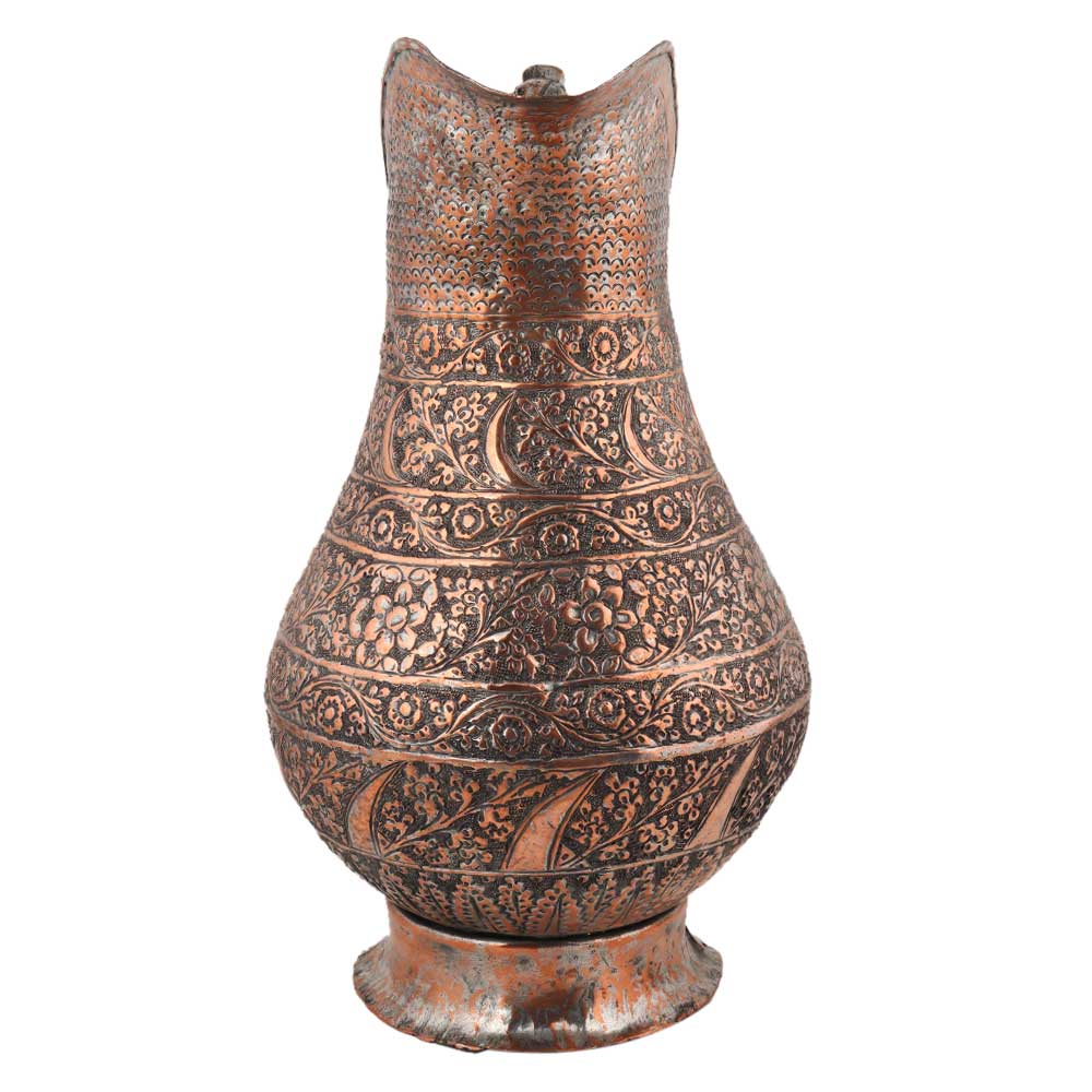 Copper Tinned Islamic Jug With Carved Flowers and Leaves done by expert artisans. Used as table and kitchen display. Diwali decoration, New year gift, anniversary gift, birthday gift for y our near and dear ones.