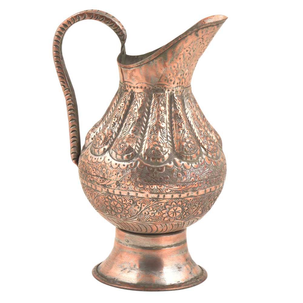 A large hand made and beaten copper water pitcher handmade with a very intricate design covering almost every area of the jug including the handle, but excepting the foot. The design is similar to indo persian design with lots of flowers and leaves all over the surface of the jug .
