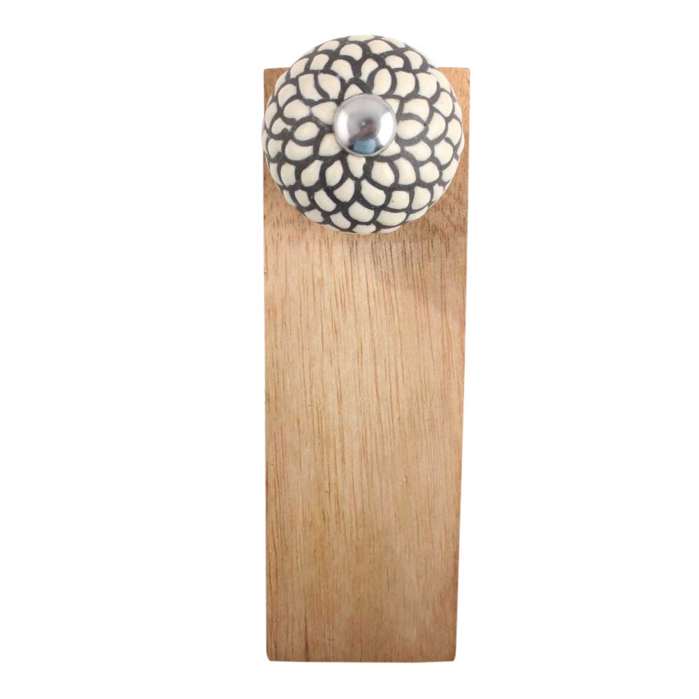 The Cream and Black Etched Ceramic Wooden Door Stopper is easy to care for. A quick wipe with a damp cloth will keep the ceramic surface looking fresh and clean. The wooden base adds a rustic charm while providing sturdy support, ensuring it holds up to daily use.