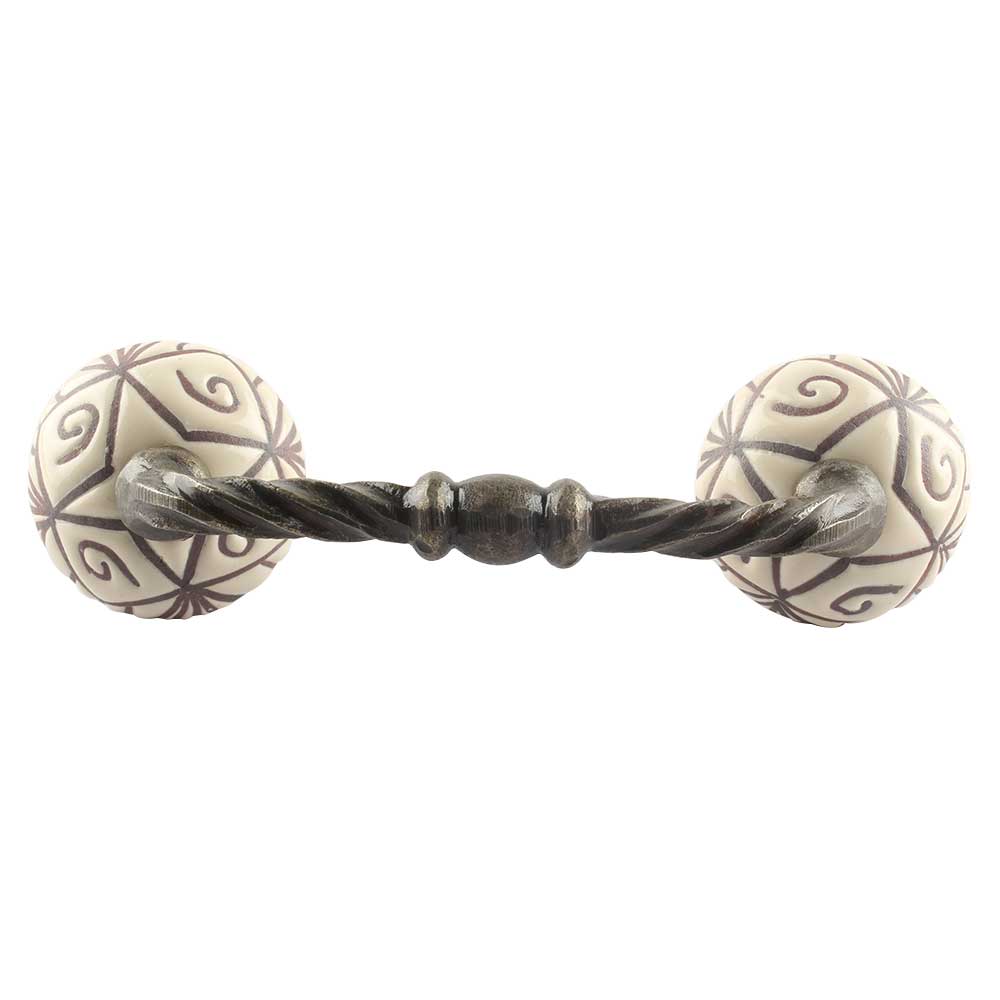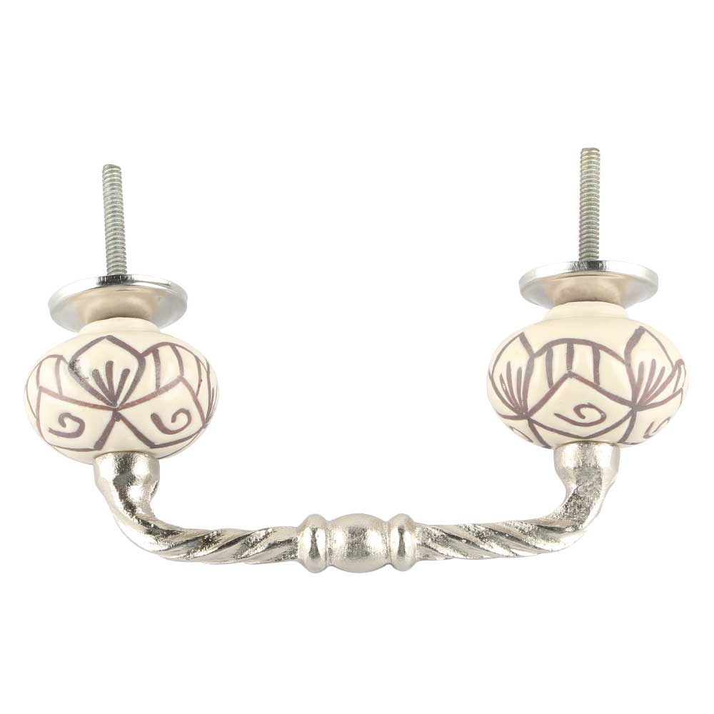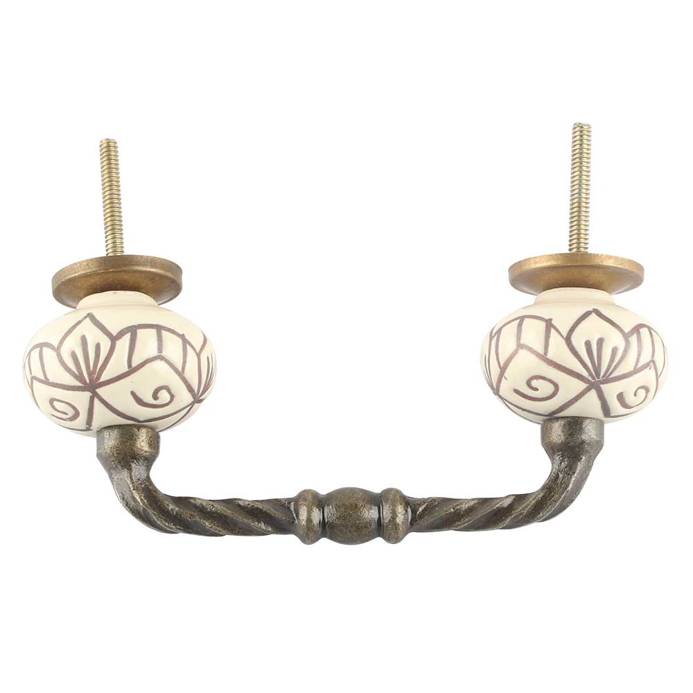 Cream Base Brown Etched Ceramic Floral Cut Bridge Handle. Ideal for Drawer, Dresser, Cabinet, Wardrobe, Cupboard and Almirah etc.