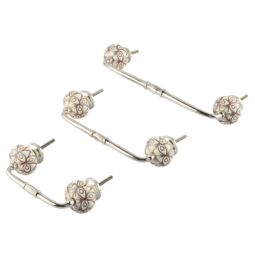 Cream Brown Floral Etched Ceramic Bridge Handle. Ideal for Drawer, Dresser, Cabinet, Wardrobe, Cupboard and Almirah.