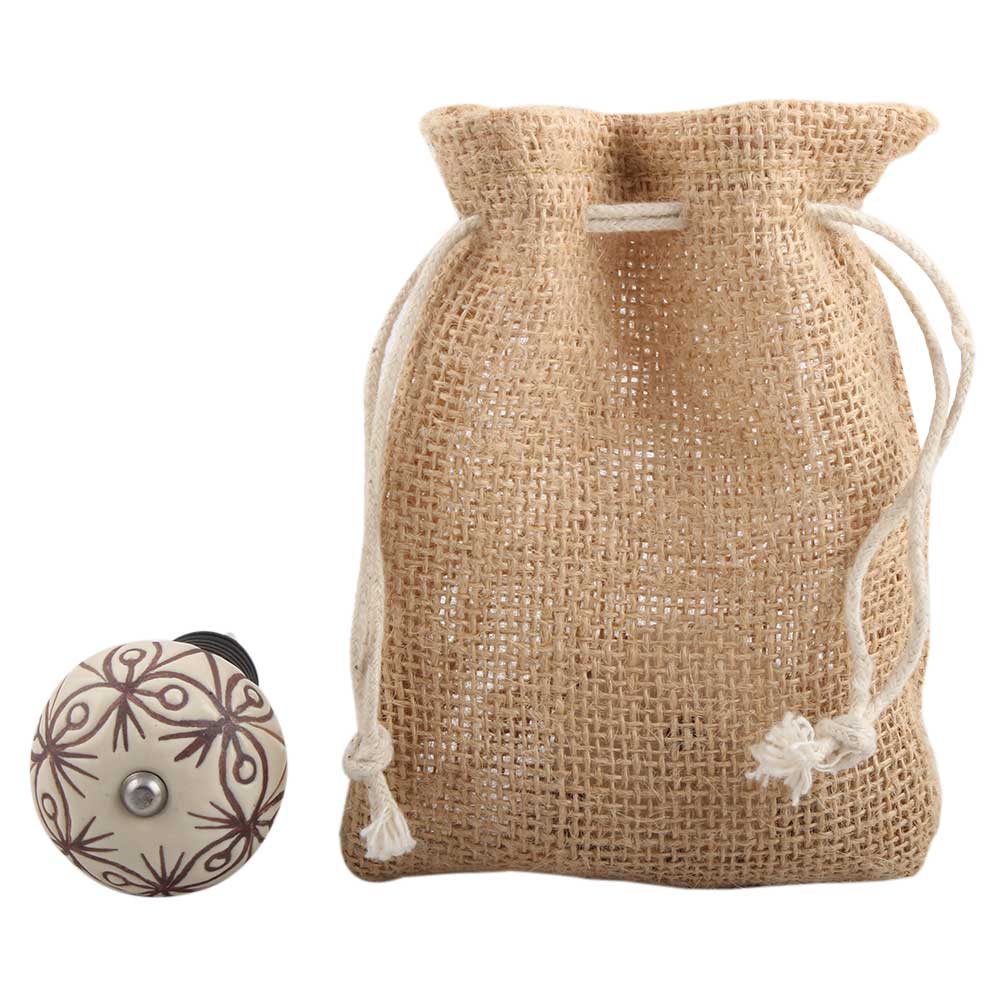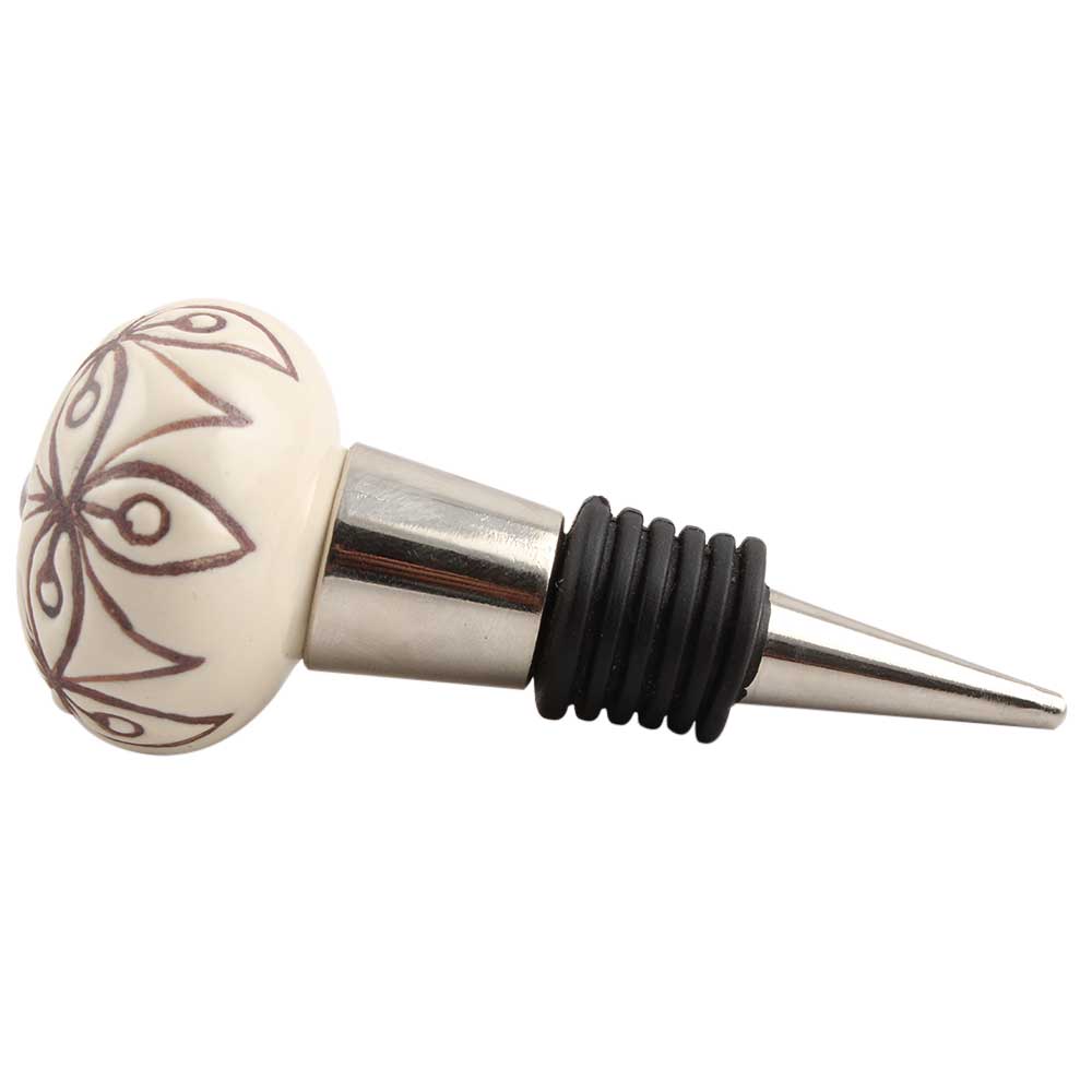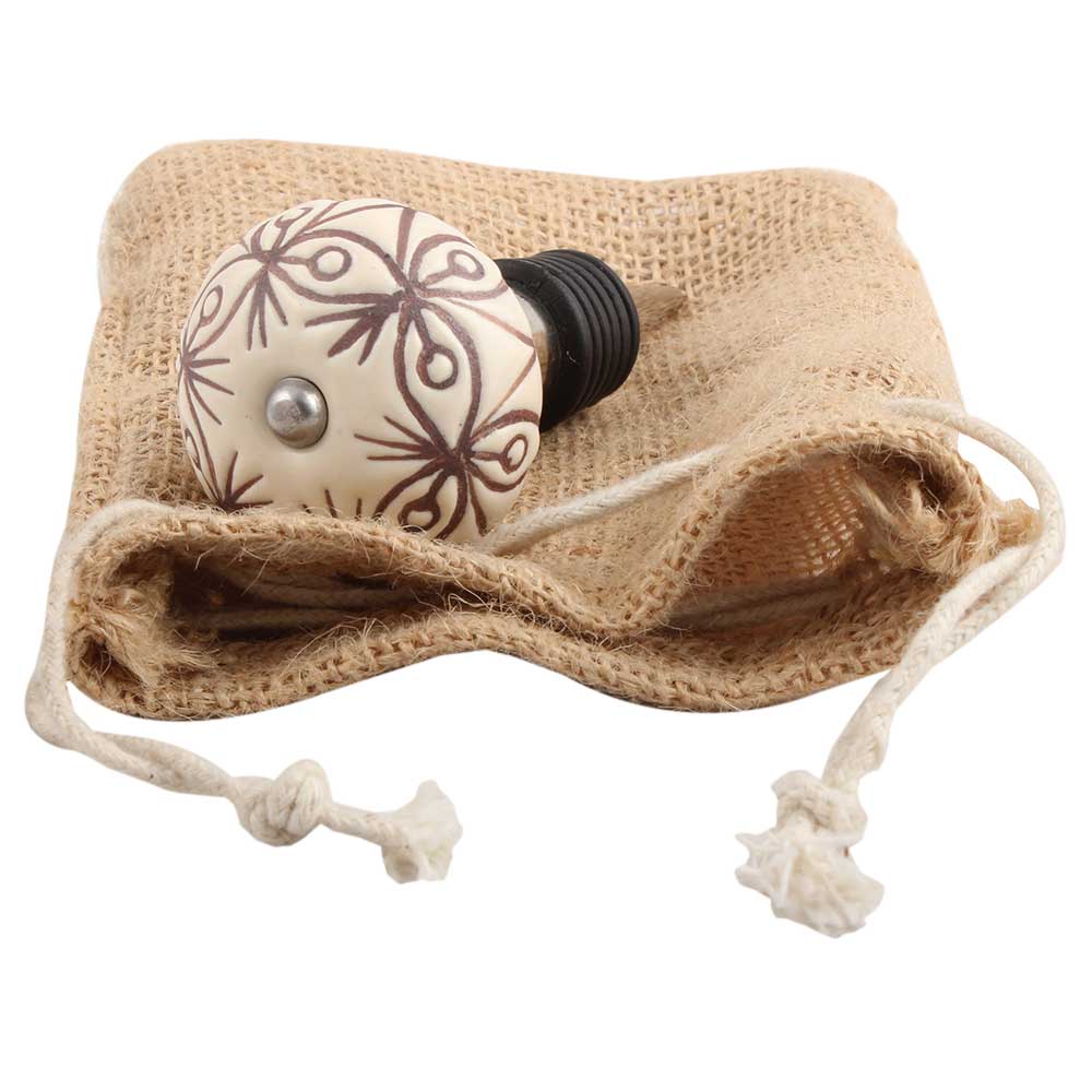 Cream Brown Floral Etched Ceramic Wine Stopper.zinc alloy wine bottle stopper with attractive Jute Bag Packaging.