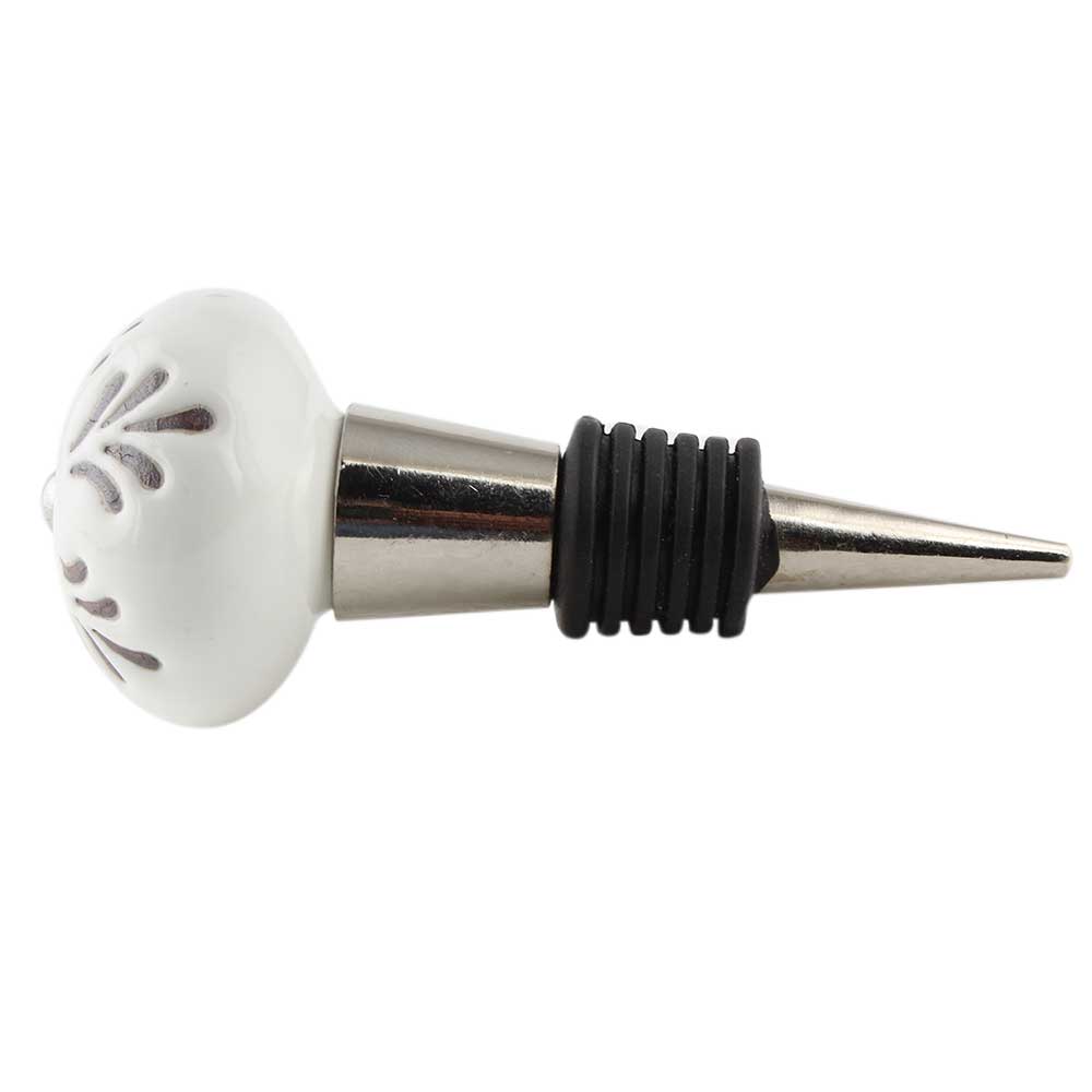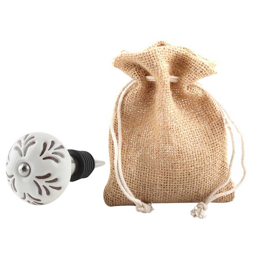 Cream Etched Leaf Ceramic Wine Bottle Stopper. Zinc Alloy Wine Bottle Stopper with Attractive Jute Bag Packaging.