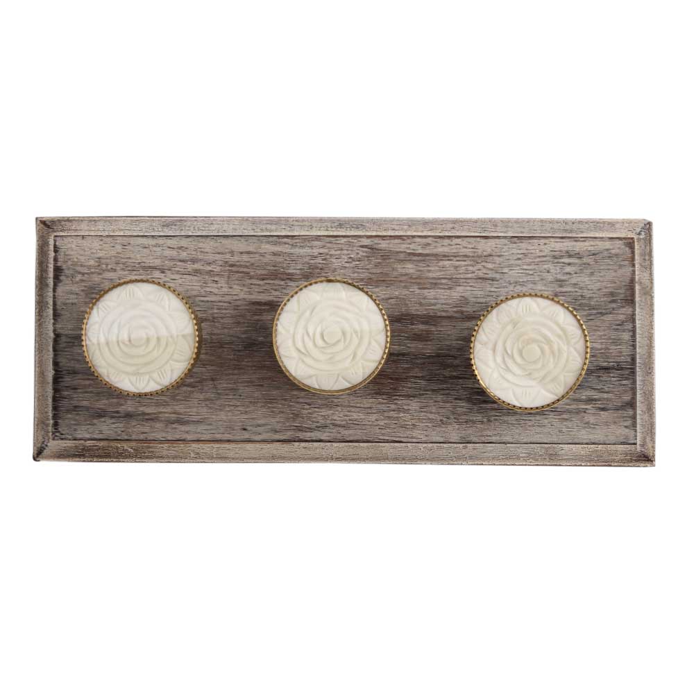 Cream Round Rose Bone and Metal Wooden Hook. A Perfect Complement to the Soft Tone of the Wood are these White Traditional Hat & Coat Hook Made of Genuine Porcelain and Brass. It can be use to Hang Jewellery, Leashes, Towels, Scarves, Light Weight Sweaters, Caps Etc.