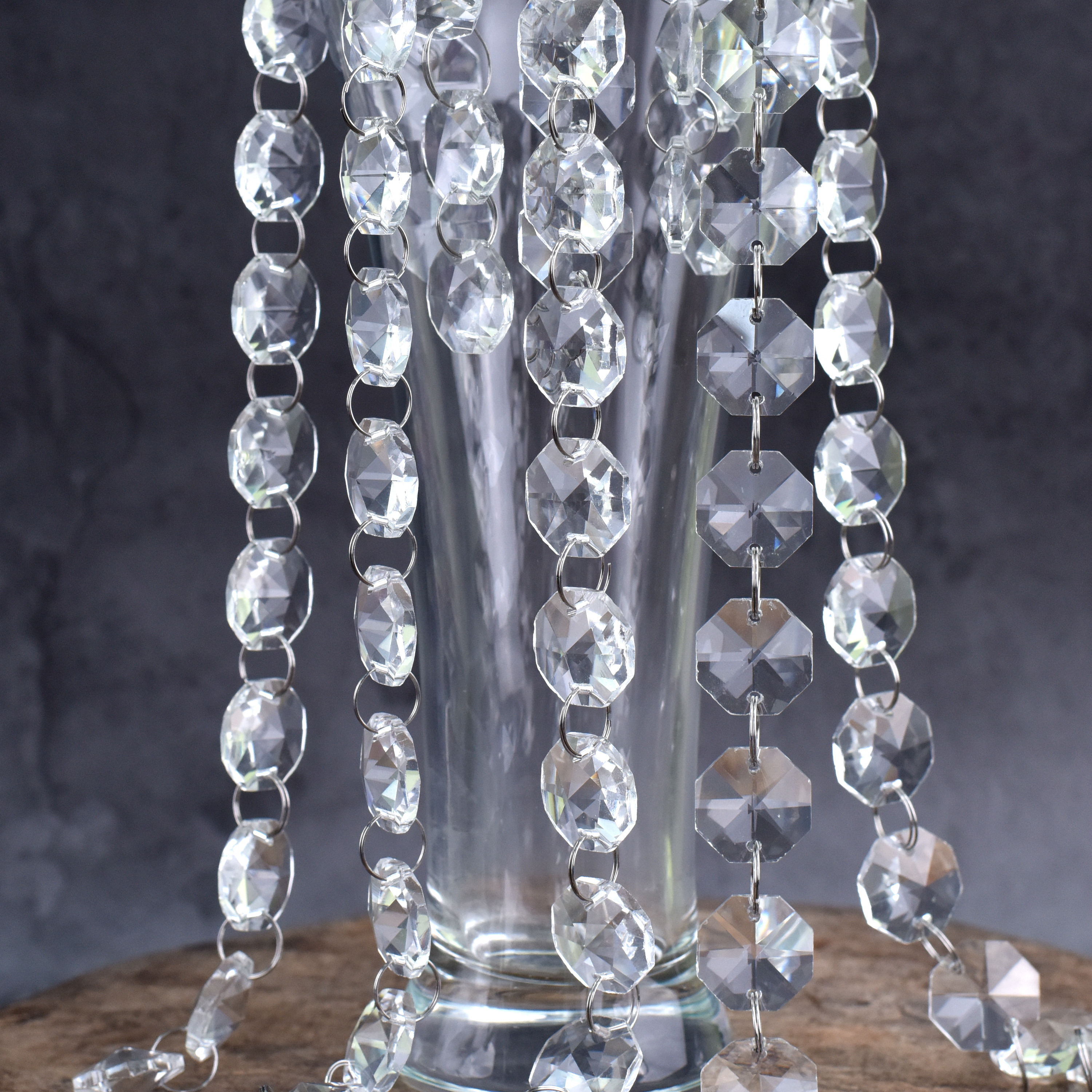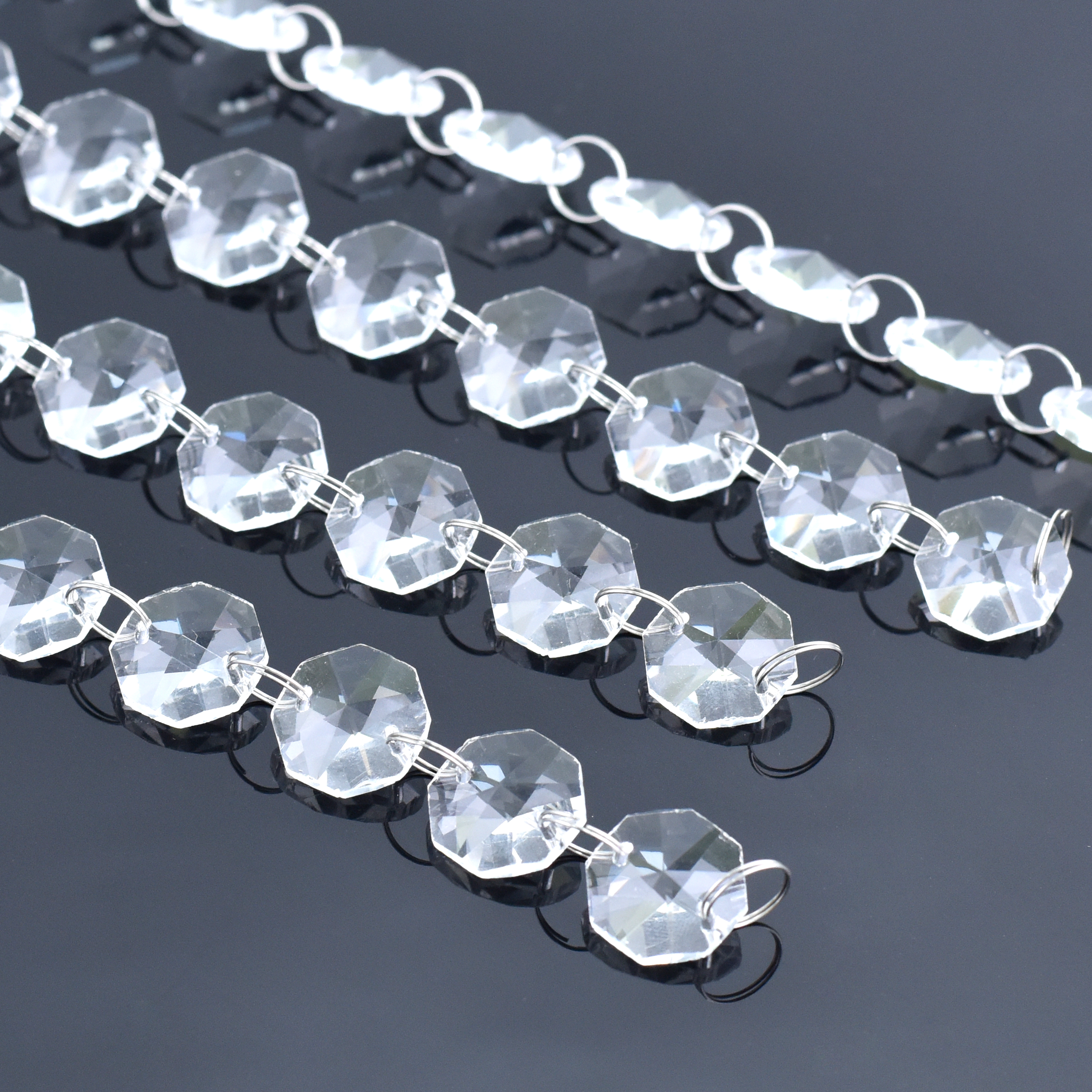 With this stunning crystal garland strand, you can have a stylish wedding. It can be used to decorate a floral display, make a crystal curtain, have a center piece wishing tree, or decorate a table. Each garland contains 50 crystal clear glass beads. This is the same type of crystal that is used to adorn antique and vintage crystal chandeliers. Crystal glass beads have a brilliant faceted edge that catches the light, making them pure and sparkly. High hardness, difficult to scratch. Metal rings hold the crystal strands together, allowing you to easily adjust the length and width of the strands.