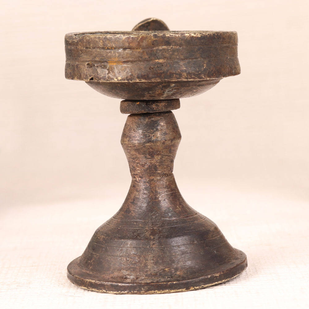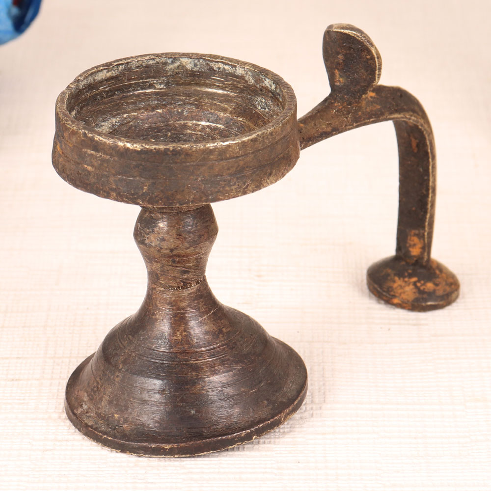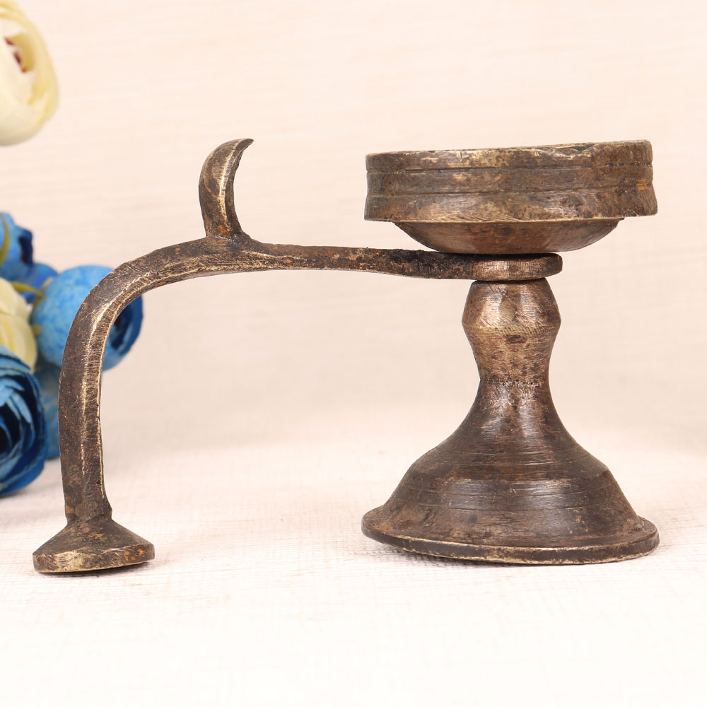 A Vintage Brass Aarti (Prayer) Lamp with a cobra handle that is a testament to the rich cultural heritage of India. Handcrafted by professional artisans from Western India, this masterpiece embodies craftsmanship at its finest. Crafted from high-quality brass and finished in an antique brown patina, it exudes timeless elegance. This versatile lamp is more than just a decorative piece, it's a symbol of tradition and spirituality. Perfect for your home, office, restaurant, hotel, shop, or cafe, it graces prayer rooms during morning and evening rituals, casting a warm and inviting glow. Its intricate cobra handle adds a touch of mystique. Vintage collectors will cherish this unique piece, and it's a stunning addition to any exhibition. To illuminate it, simply use mustard oil or ghee with cotton wicks, infusing your space with a serene ambiance. Celebrate special, festive, or auspicious occasions by gifting this lamp to your loved ones, sharing the warmth of tradition and artistry. Embrace the heritage of India with this Vintage Brass Aarti Lamp, a true work of art that transcends time.