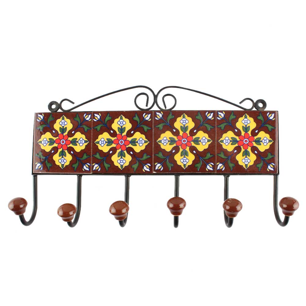 Dark Brown Floral Ceramic Tile Hook. When Put on Wall or Cabinet It is An Art in Itself. The Metal Part of this Hook is Black Powder Coated.
