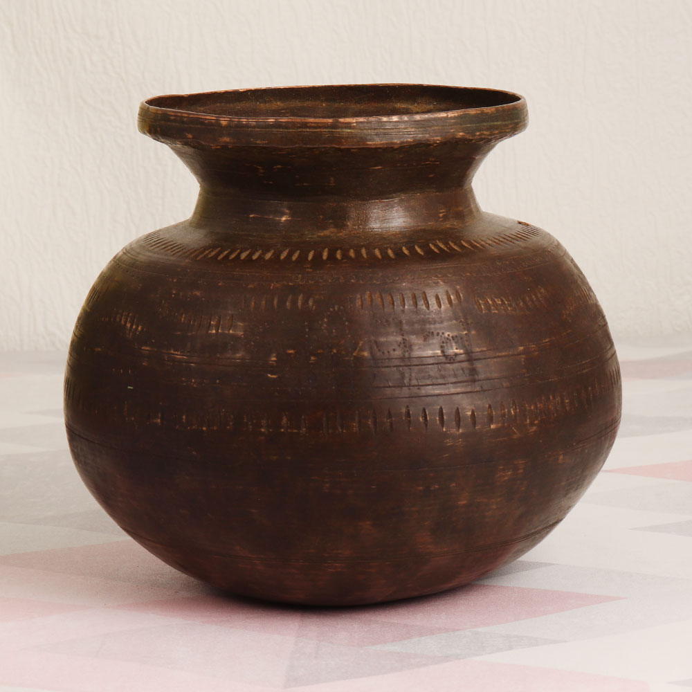 A Vintage Brass Holy Water Pot that is a timeless masterpiece steeped in South Indian artistry. Handcrafted by highly skilled Indian craftsmen, this enchanting piece exudes an air of ancient charm with its antique brown finish. Crafted from high-quality brass, it serves as both a functional and aesthetic treasure. This versatile artefact can grace your home, office, restaurant, hotel, cafe, or shop, enhancing the ambiance with its ornate design. It's not just a piece of art but a sacred vessel, perfect for havan, rituals, and auspicious occasions, as it gracefully holds holy water. Its spiritual significance makes it an ideal addition to your home, particularly when placed in the north direction of a room, spreading positive energy. Apart from its sacred duties, this holy water pot can double as an indoor flower pot, adding natural beauty to your space. Whether you're an antique collector or searching for a unique gift, this piece is a splendid choice. Surprise your loved ones on special, festive, or auspicious occasions with a gift that encapsulates heritage and tradition.
