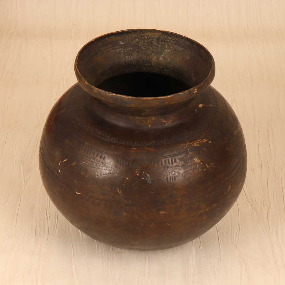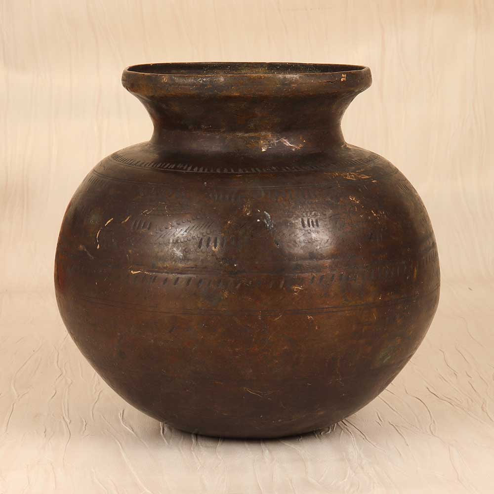 Step back in time with this antique brass holy water pot, beautifully engraved with traditional Gujarati designs. The solid brass construction ensures durability, while the vintage patina adds character and charm. This is a true collectors item. This pot features exquisite craftsmanship rarely seen today. Intricate Gujarati patterns swirl around the surface, applied by a skilled artisan of years past. The elegant spout allows for easy dispensing during prayers or rituals. A wonderful example of India's rich cultural heritage. For devotees and spiritual collectors, this holy water pot is a must. Use it to store sacred water in your home shrine as a beloved artifact of faith. Or display it as an accent piece and conversation starter. However, you use it, this vintage pot brings history to life. Don't miss your chance to own this unique piece of antiquity!