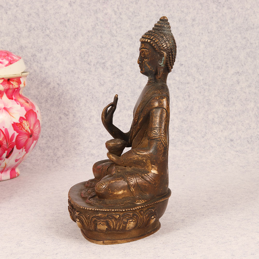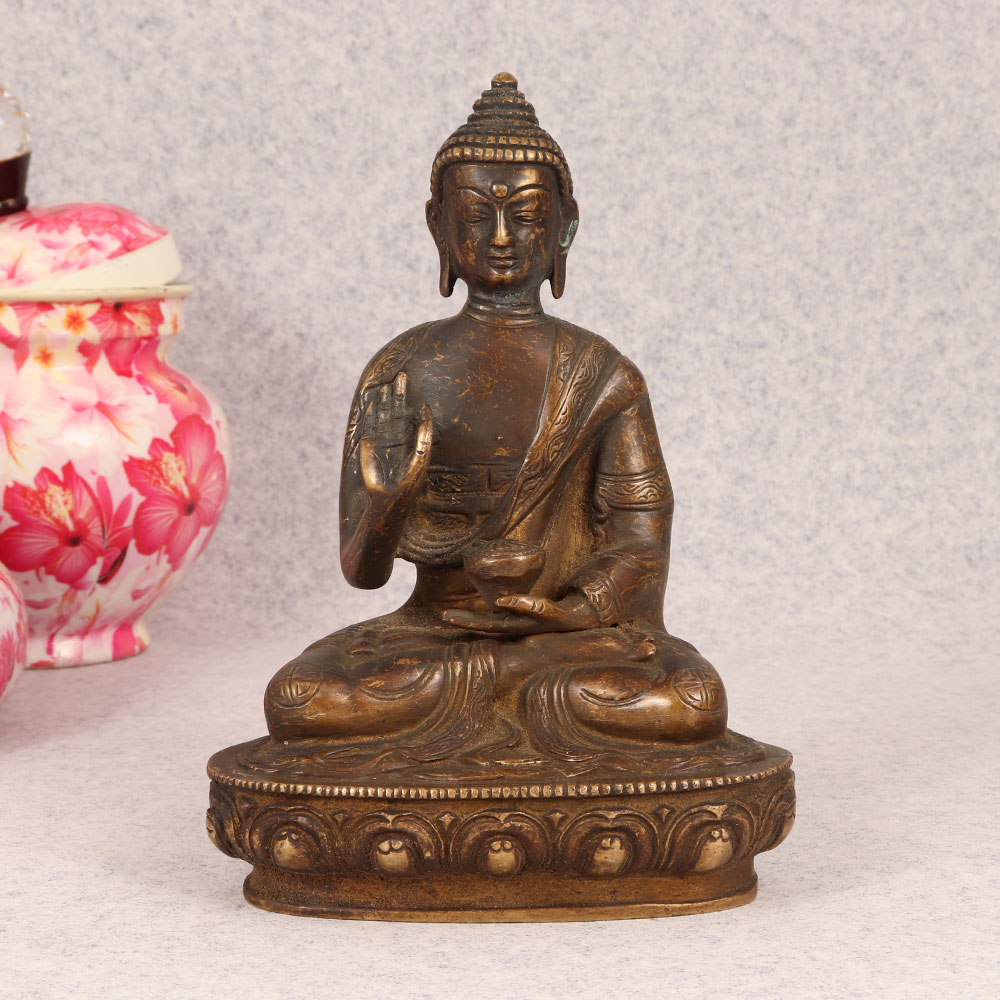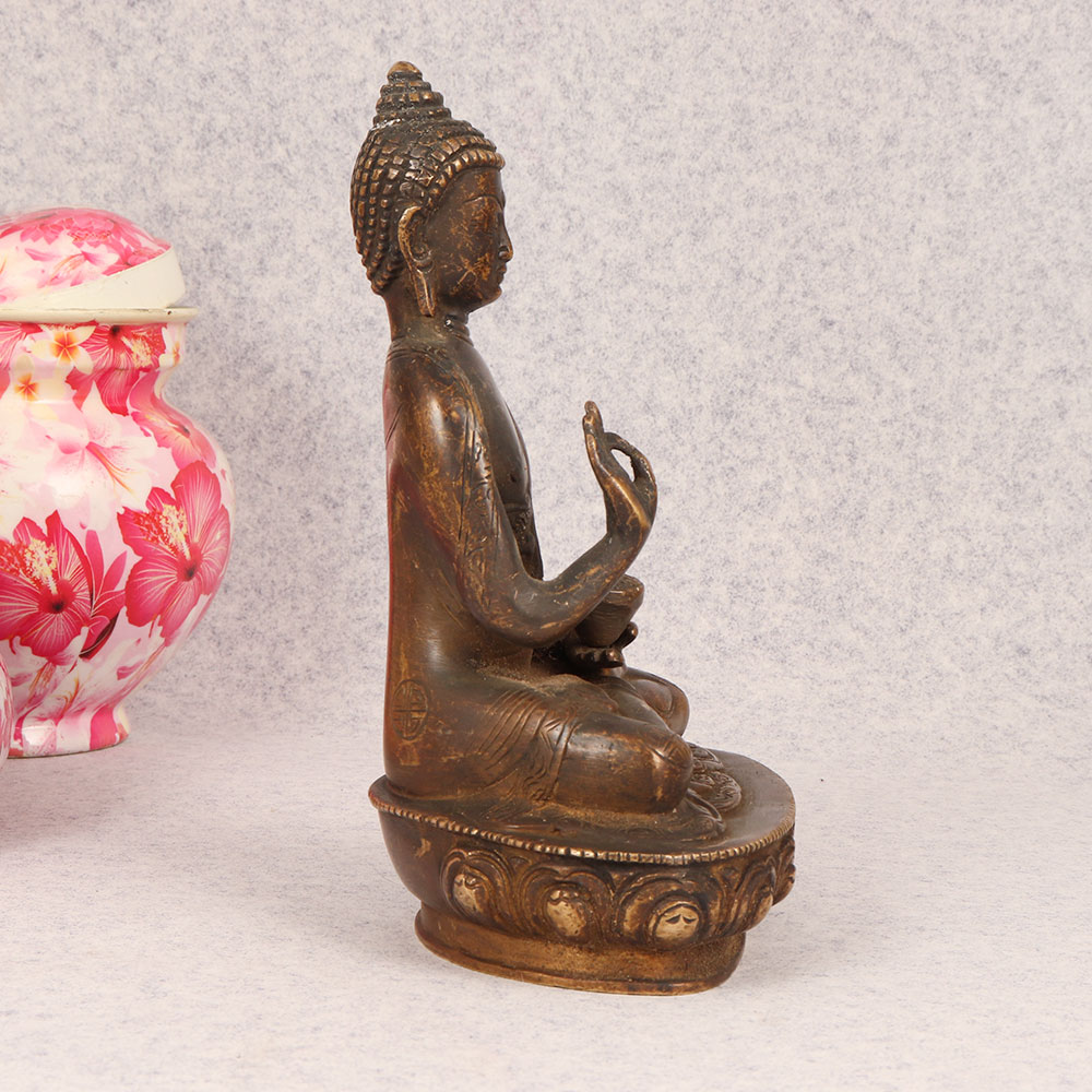 Buy a Brass Lord Buddha Statue online which is a sublime masterpiece crafted with precision by skilled Indian artisans. This exquisite statue boasts a mesmerizing dark finish that adds an aura of elegance and tranquillity to any space. Meticulously handmade from high-quality brass, the attention to detail is evident in every curve and contour, capturing the serenity and wisdom associated with Lord Buddha. Ideal for various settings, including homes, offices, restaurants, hotels, or cafe prayer rooms, this statue serves as a timeless symbol of peace and enlightenment. Its versatile design seamlessly blends with any decor style, making it a perfect addition to both contemporary and vintage collections. The craftsmanship reflects the rich heritage of Indian artistry, creating a unique and authentic piece that resonates with cultural significance. Beyond its aesthetic appeal, the Brass Lord Buddha Statue makes for a thoughtful and meaningful gift for your family, friends or relatives on special, festive, or auspicious occasions. Whether it's a housewarming, birthday, or a momentous celebration, this statue symbolizes blessings, positivity, and a harmonious presence, making it a cherished and enduring token of goodwill and spirituality. Embrace the timeless beauty and spiritual essence embodied in this handcrafted masterpiece.