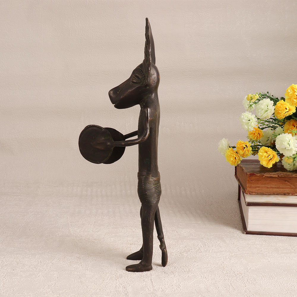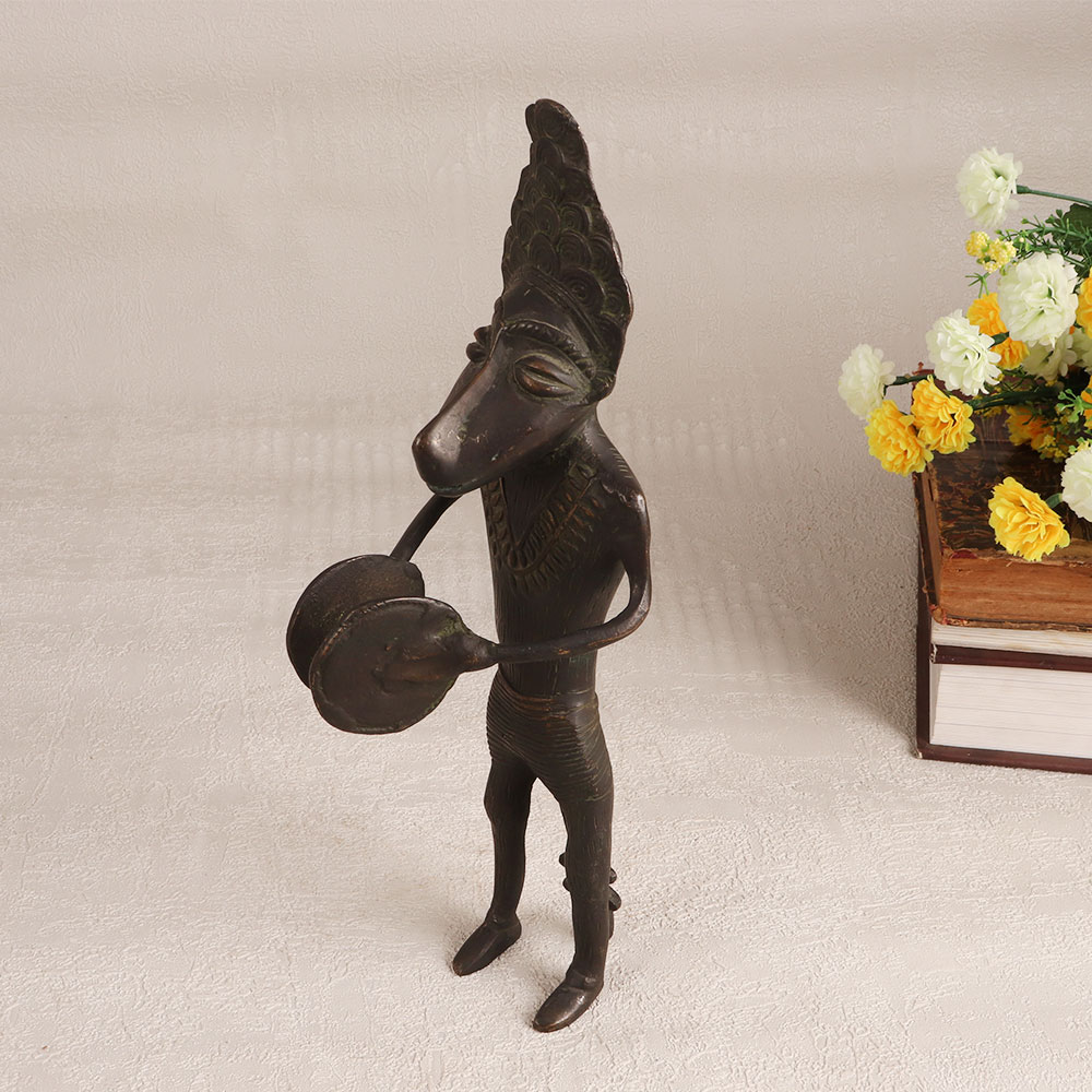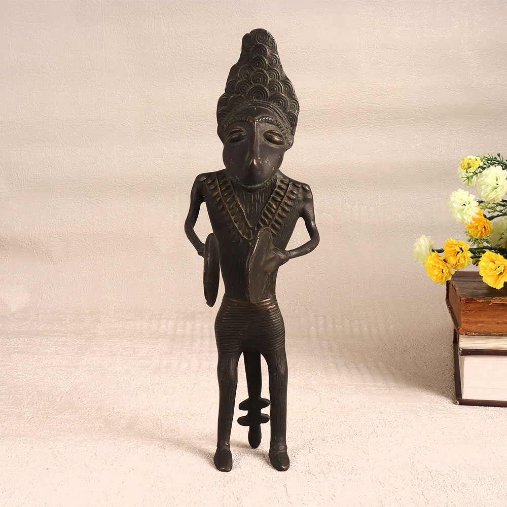 Enhance your home interior with a captivating piece of artistry which is a stunning brass statue of a male figure standing proudly and playing the cymbal. This masterpiece is exquisitely crafted by professional Indian artisans in the tradition of Folk Himalayan Art and embodies the rich cultural heritage and craftsmanship of the region. The statue boasts an antique dark finish that imparts a sense of history and character, making it a timeless addition to any space. Meticulously handcrafted from high-quality brass, this piece radiates authenticity and quality. Its versatility knows no bounds, as it can adorn your home, office, hotel, cafe, shop, or restaurant with its artistic presence. This versatile statue is perfect for adding a touch of elegance to any setting. Beyond its decorative appeal, this brass figure is a valuable addition to vintage collections and an eye-catching exhibit for special exhibitions. It's an ideal gift choice for your family, friends or relatives on special, festive, or auspicious occasions, symbolizing the beauty of tradition and artistic expression. Embrace the fusion of art and history with this exceptional brass statue, a testament to the timeless beauty of Folk Himalayan Art.