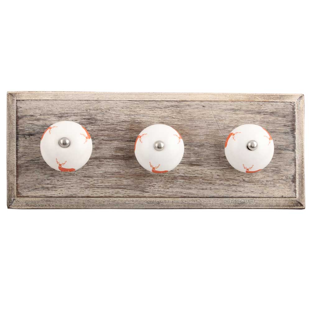 Dark Orange Standing Rein Deer Pattern Ceramic Wooden Hook. A Perfect Complement to the Soft Tone of the Wood are these White Traditional Hat & Coat Hook Made of Genuine Porcelain and Brass. It can be use to Hang Jewellery, Leashes, Towels, Scarves, Light Weight Sweaters, Caps Etc.