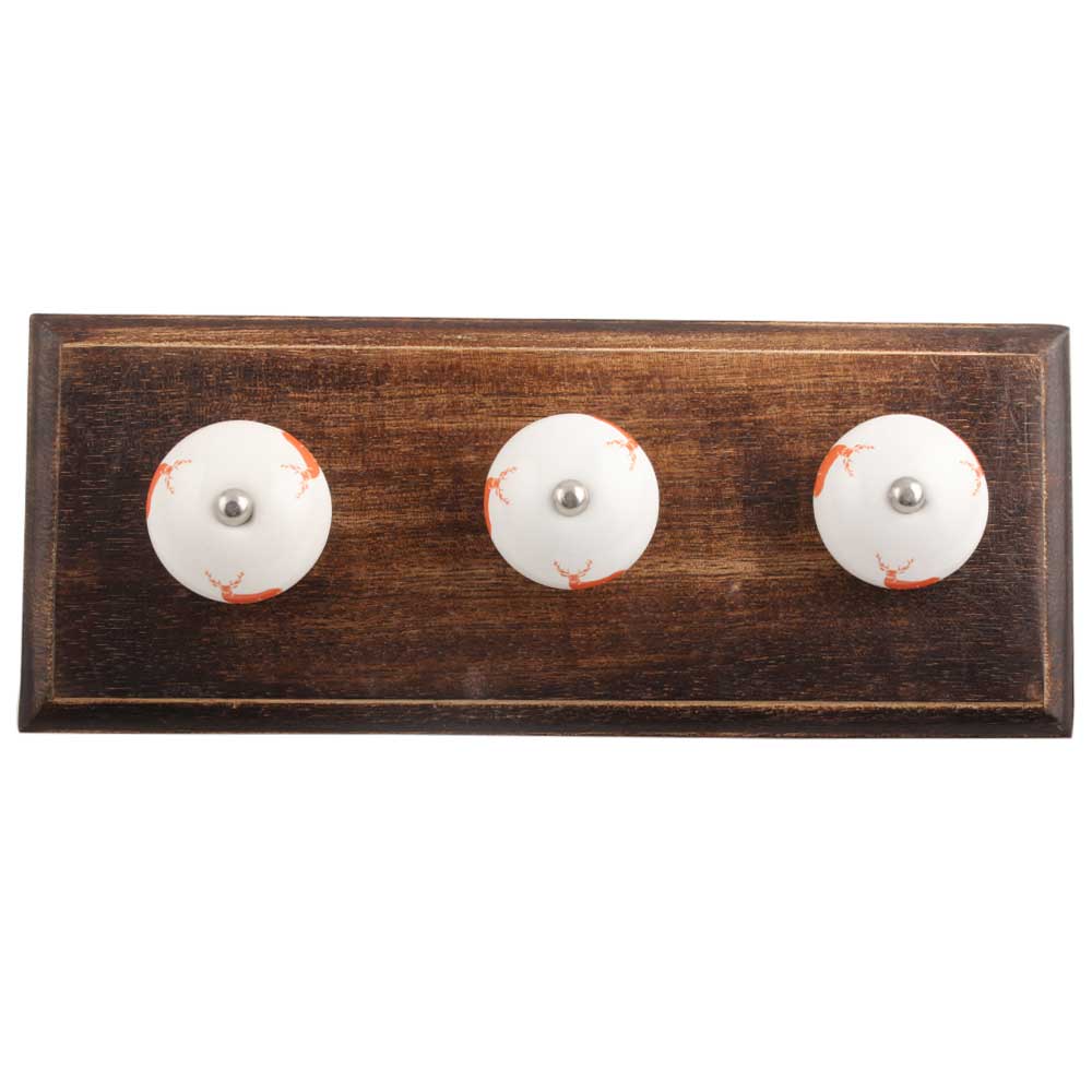 Dark Orange Standing Rein Deer Pattern Ceramic Wooden Hook. A Perfect Complement to the Soft Tone of the Wood are these White Traditional Hat & Coat Hook Made of Genuine Porcelain and Brass. It can be use to Hang Jewellery, Leashes, Towels, Scarves, Light Weight Sweaters, Caps Etc.