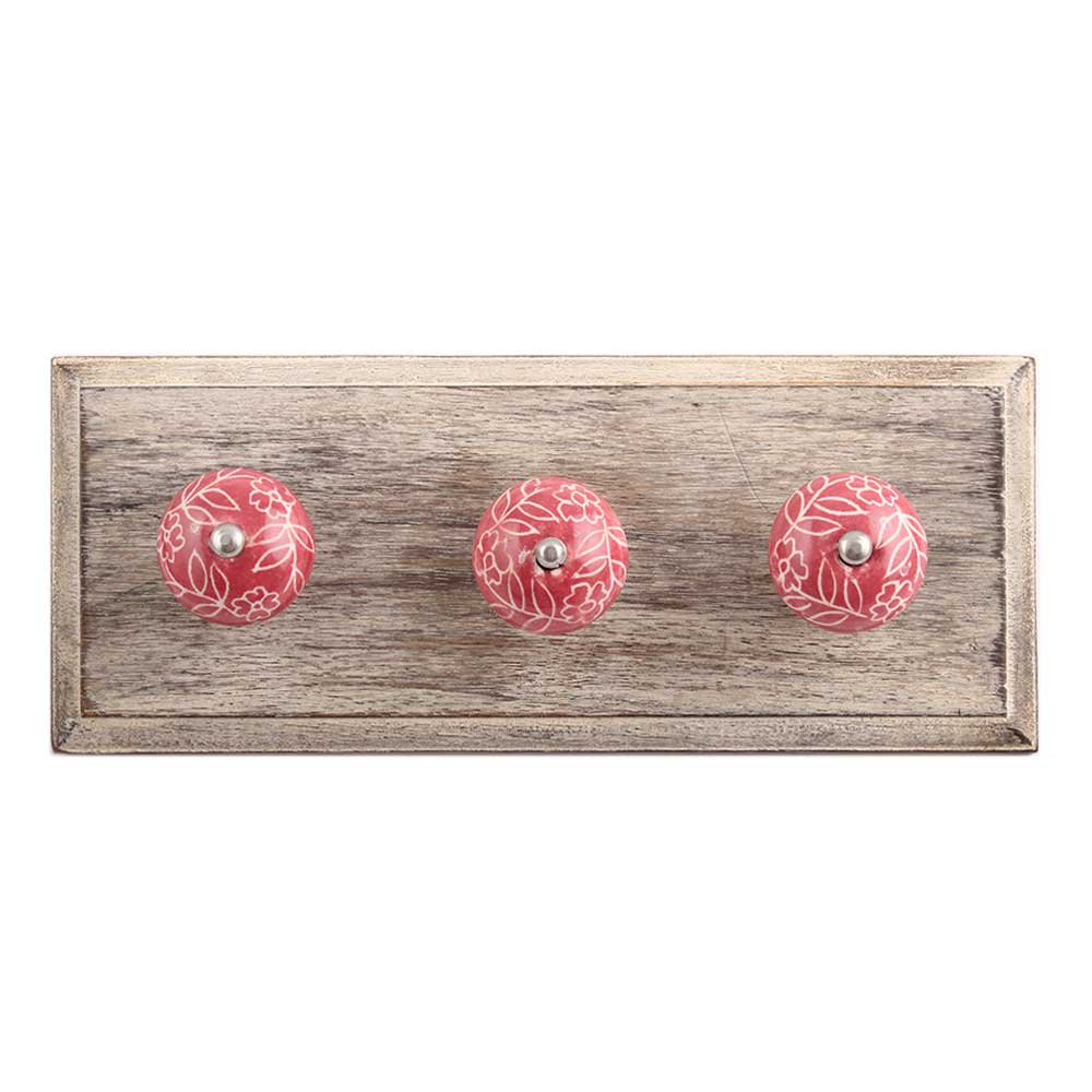 Dark Pink Leaf Floral Ceramic Wooden Hook. A Perfect Complement to the Soft Tone of the Wood are these White Traditional Hat & Coat Hook Made of Genuine Porcelain and Brass. It can be use to Hang Jewellery, Leashes, Towels, Scarves, Light Weight Sweaters, Caps Etc.