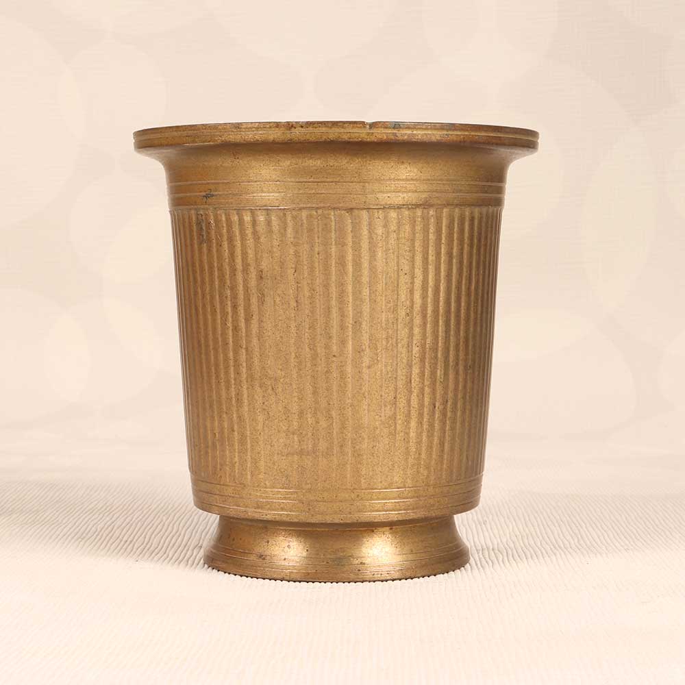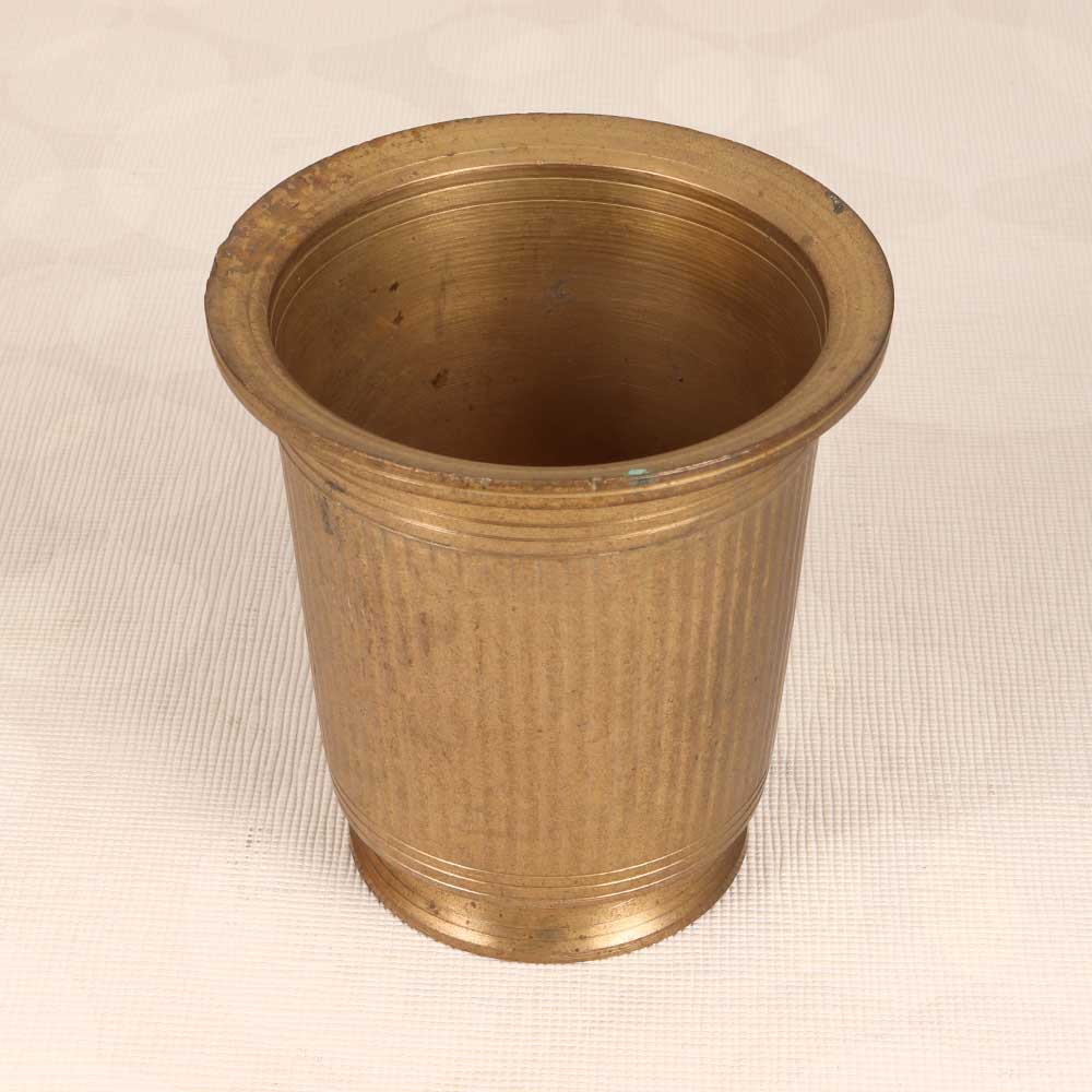 Step into the divine with this vintage brass holy water cup showcasing South Indian art. The detailed motifs and symbols honor ancient traditions, while the simple brown patina provides an earthy elegance. Keep on your home altar or puja space for convenient access during rituals, or place a fresh flower arrangement inside to infuse your home with tranquil spirituality. The solid brass construction withstands years of use, making this a cherished heirloom to pass down. Let its graceful form and rich history deepen your connection to the sacred.