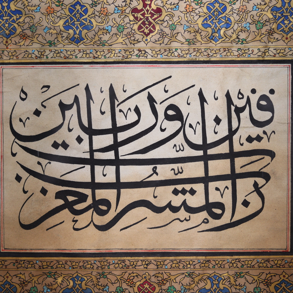 Immerse yourself in the captivating world of Islamic art with this exquisite calligraphy piece. Masterfully created by skilled artisans, this work beautifully captures the sacred essence of the Islamic faith through the timeless art of calligraphy. The flowing, elegant lines of the calligraphy are accentuated by a vibrant, hand-painted color palette and an intricate border design that adds depth and sophistication. Framed in a modern, sleek frame, this piece effortlessly blends traditional Islamic artistry with a contemporary aesthetic, making it a stunning addition to any space. Whether displayed in your home, office, or place of worship, this Islamic calligraphy art will inspire and uplift you, reminding you of the profound beauty and wisdom found in the Islamic tradition. Invest in this exceptional work of art and let it transport you to a realm of spiritual contemplation and artistic wonder.