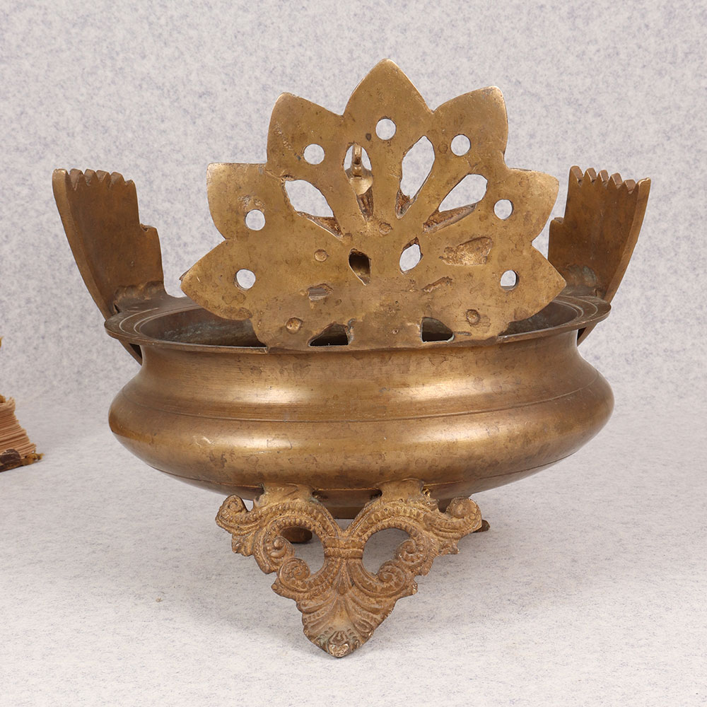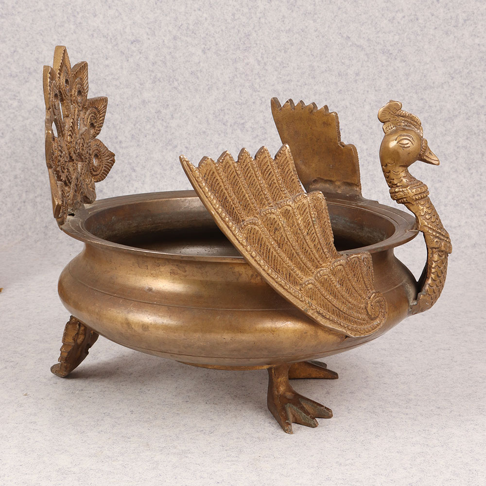 Buy a brass Urli online that is a captivating fusion of artistry and tradition. Handcrafted by highly talented Indian artisans in the esteemed South Indian Art tradition, this Urli boasts a unique peacock carving, symbolizing grace and elegance. The three intricately designed legs lend a classic charm to the piece, elevating its aesthetic appeal. Crafted from high-quality brass, the Urli showcases a rich antique brown finish, adding a touch of vintage allure to any space. Its versatile design allows it to seamlessly complement various settings, making it a perfect addition to homes, offices, restaurants, hotels, or cafes. Whether displayed as a standalone statement piece or incorporated into a vintage collection, this Urli effortlessly enhances the ambiance with its timeless charm. This masterpiece is not only a visual delight but also a thoughtful gift for your family, friends or relatives on special, festive, or auspicious occasions. Its craftsmanship and cultural significance make it a symbol of tradition, making it a cherished addition to any home or a distinctive touch to commercial spaces. Elevate your decor with the timeless beauty of our brass Urli, a testament to the craftsmanship and artistic heritage of South India.