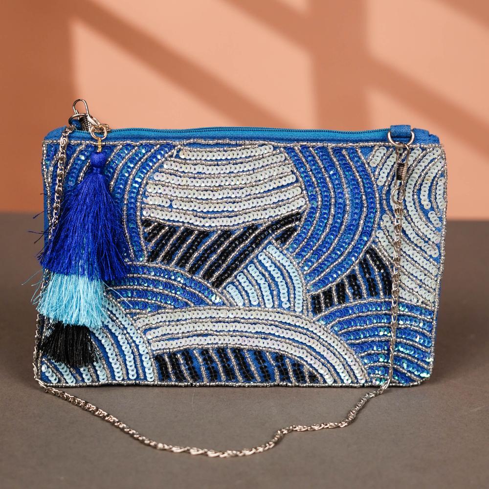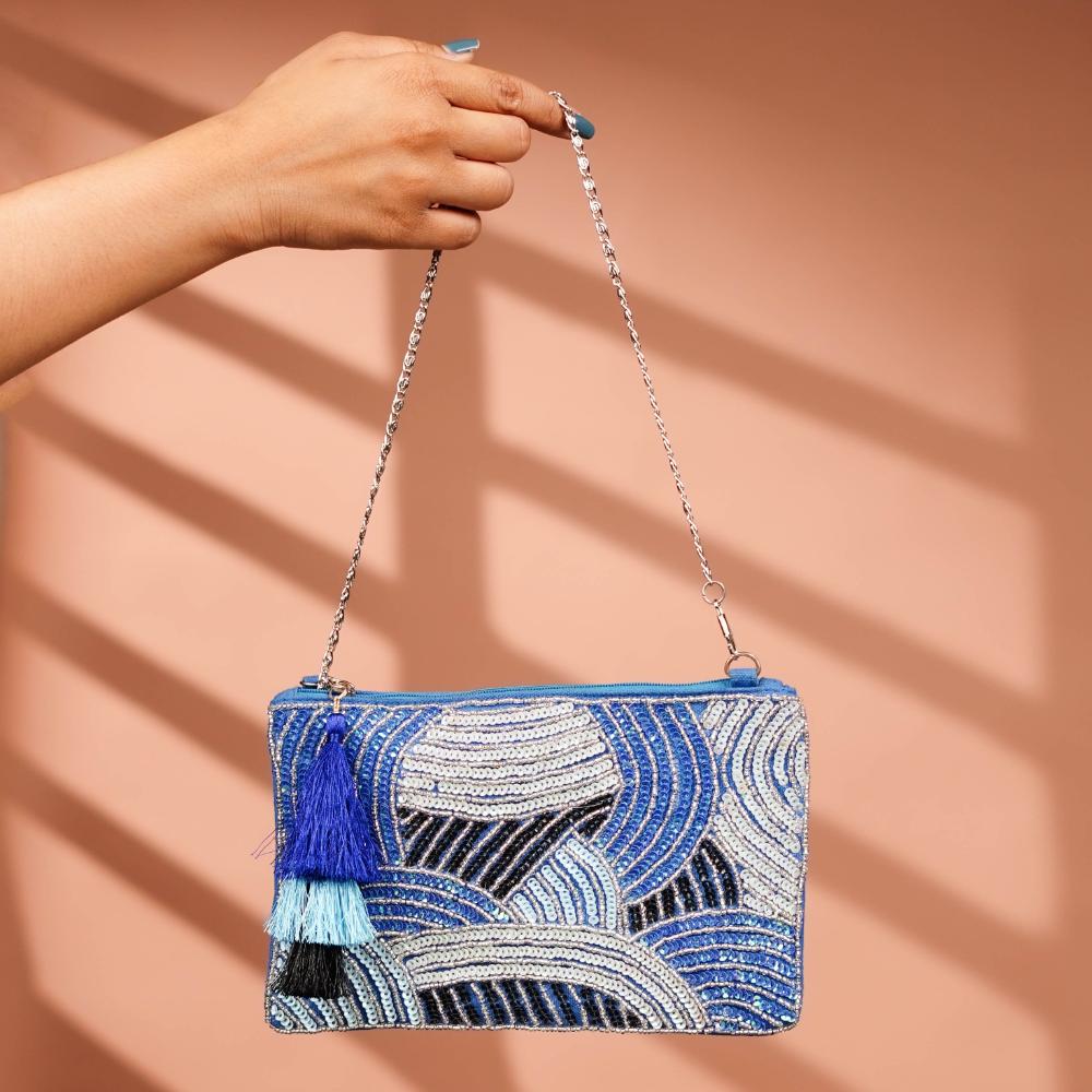Inspired by the serene patterns of coastal landscapes, this cotton and beads handbag features a contemporary take on seaside motifs. The overlapping beadwork in ocean blues and shimmering silver creates a rich texture that’s visually dynamic. A multitone tassel in navy, cobalt, and aqua dances from the corner, while the silver chain strap allows you to wear it with ease. It’s the ideal statement piece for the woman who loves artistic fashion and effortless sophistication.