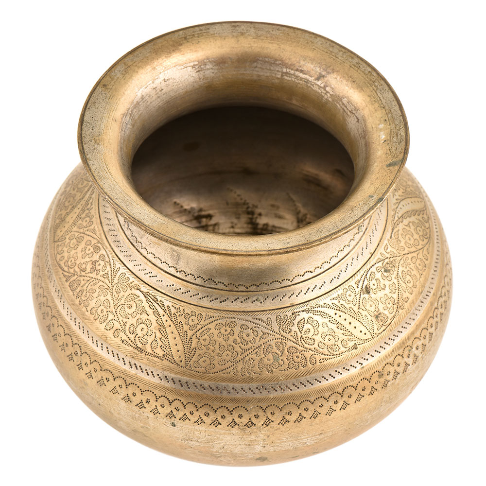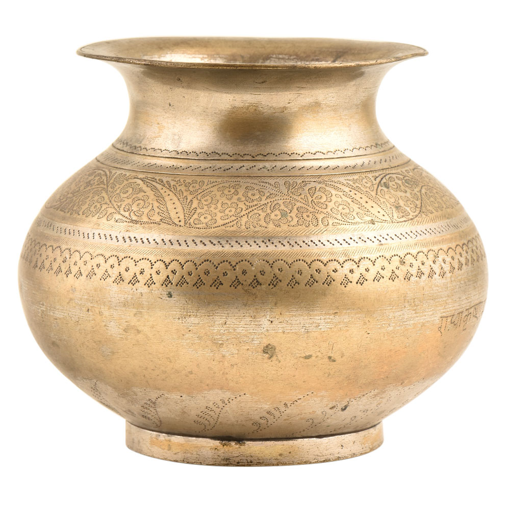 This Handmade brass lota or pot has many traditional names and was used for storing ,and carrying water from the well and also for washing the temple stairs .The pot has a gentle floral design and is made by the local artisans of India.