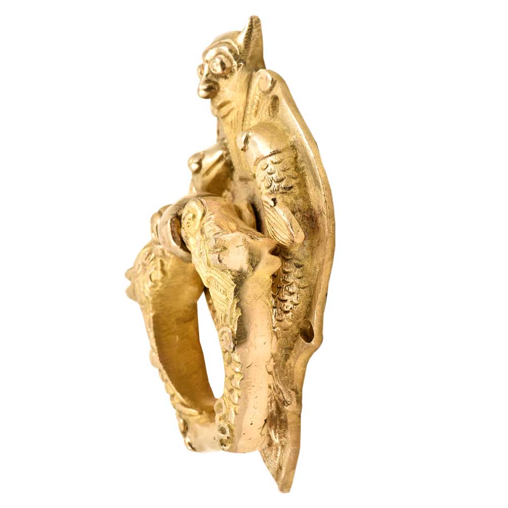 A very Solid Brass Door Knocker with two thunder dragon with two fish on either side and bat face on top with an intricately carved door knocker ring A truly perfect option for anyone, who needs their door hardware to both look good and work without any hassle. This piece sports a solid and sturdy structure and ensures years of flawless operation, while still being pleasing to look at.