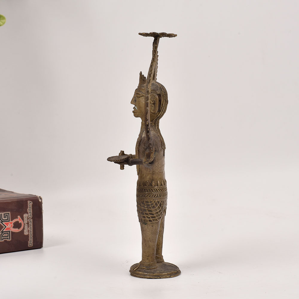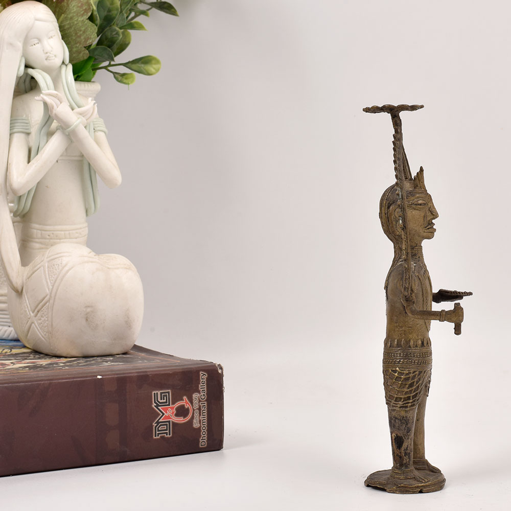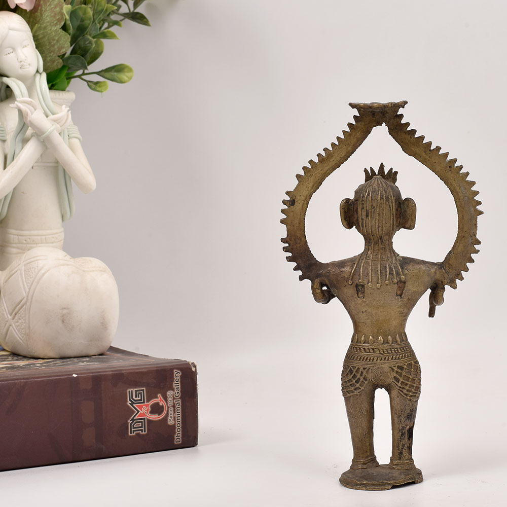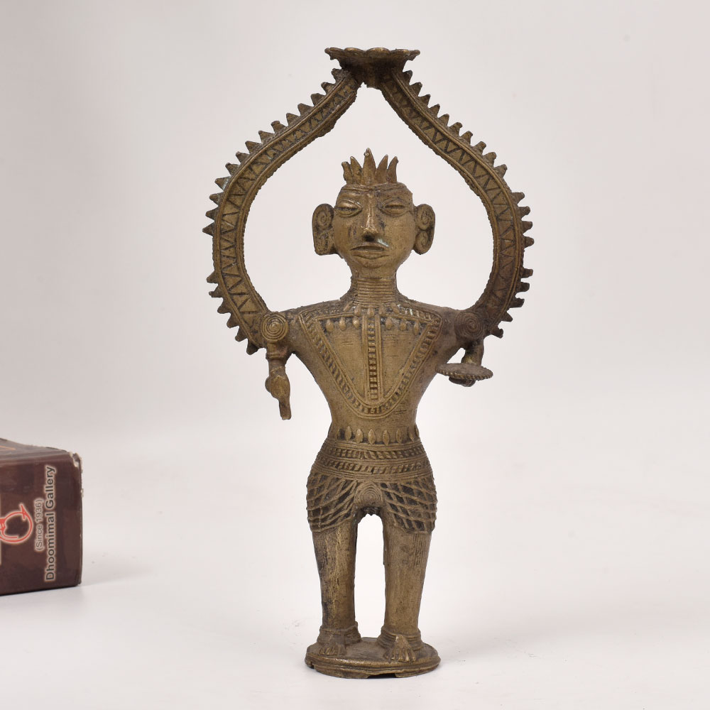 Infuse your living space with the mystical energy of the ancient world with this breathtaking brass tribal god figure. Masterfully crafted using the centuries-old Dhokra Art method, this statue is a true testament to the skilled artistry of India's indigenous metalworkers. The solid brass construction gives this piece exceptional weight and substance, while the intricate patterns and designs evoke the spiritual symbolism of revered tribal deities. Whether placed on a shelf, table, or mantle, this striking figure commands attention and elevates the aesthetic of any room. More than just a decorative accent, this tribal god statue also carries a sense of cultural significance, allowing you to incorporate the positive vibes of a revered deity into your home environment. Its bold silhouette and captivating visual details make it a true conversation piece that will impress guests and transform the ambiance of your space.