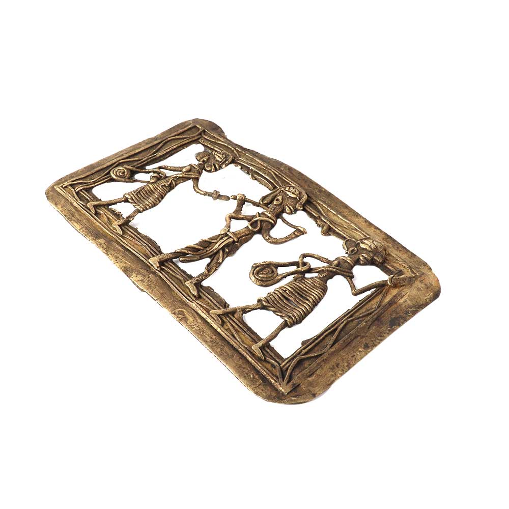 This charming brass wall hanging Dhokra Art features a farmer and two women, one of whom is holding a rope and the other a basket. The farmer is holding an axe, and they are heading to the fields. These activities are a tribal couple from the Dhokra tribe's daily routine. Decorations for the inside of homes, offices, schools, and galleries. Give it to those who are close to you.