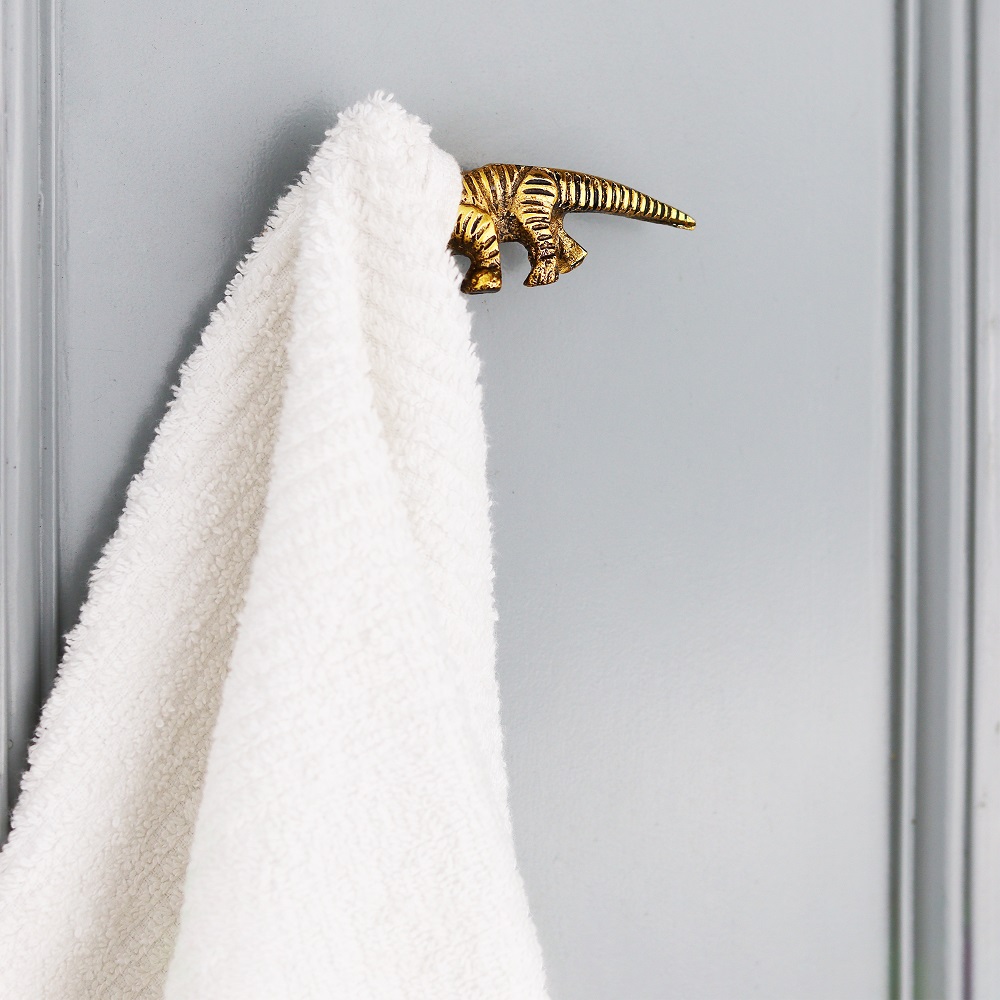Shaped like a dinosaur and finished in lustrous gold, this hook stands out as a playful yet classy addition to any wall – turning a basic utility into a standout decor feature.