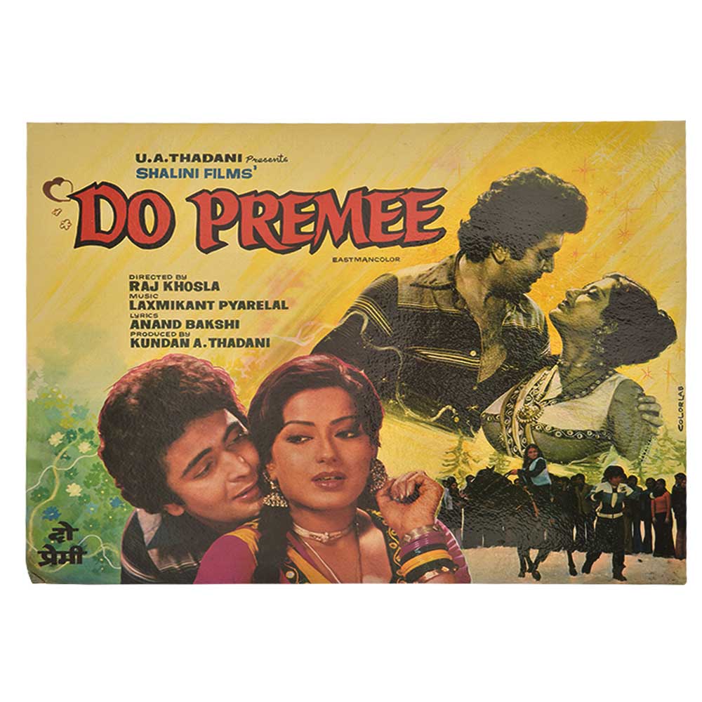 This is a 1930 movie poster of the movie Do Premee starring Rishi Kapoor and Moushmi Chatterjee in the lead roles used for promotional purposes . The movie is directed by Raj Khosla and the music was composed by Laxmikant Pyarelal.