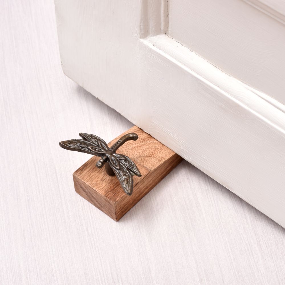 Buy a Wooden Door Stopper online that is a masterpiece crafted with precision by highly skilled Indian artisans. This exceptional piece is made from high-quality wood, adorned with an antique brown finish that radiates elegance. The door stopper features a captivating dragonfly, handcrafted from iron in a dark finish, serving as a symbol of grace and beauty. Designed to impress, this door stopper not only adds a touch of sophistication to any space but also serves a practical purpose. Its rubber grip underneath ensures a firm hold, preventing unwanted slips and securely holding doors in place. It serves as an ideal gift for your family, friends or relatives on special occasions, such as housewarmings, symbolizing blessings and good fortune. Elevate your home decor with this enchanting door stopper, combining timeless craftsmanship and functionality.