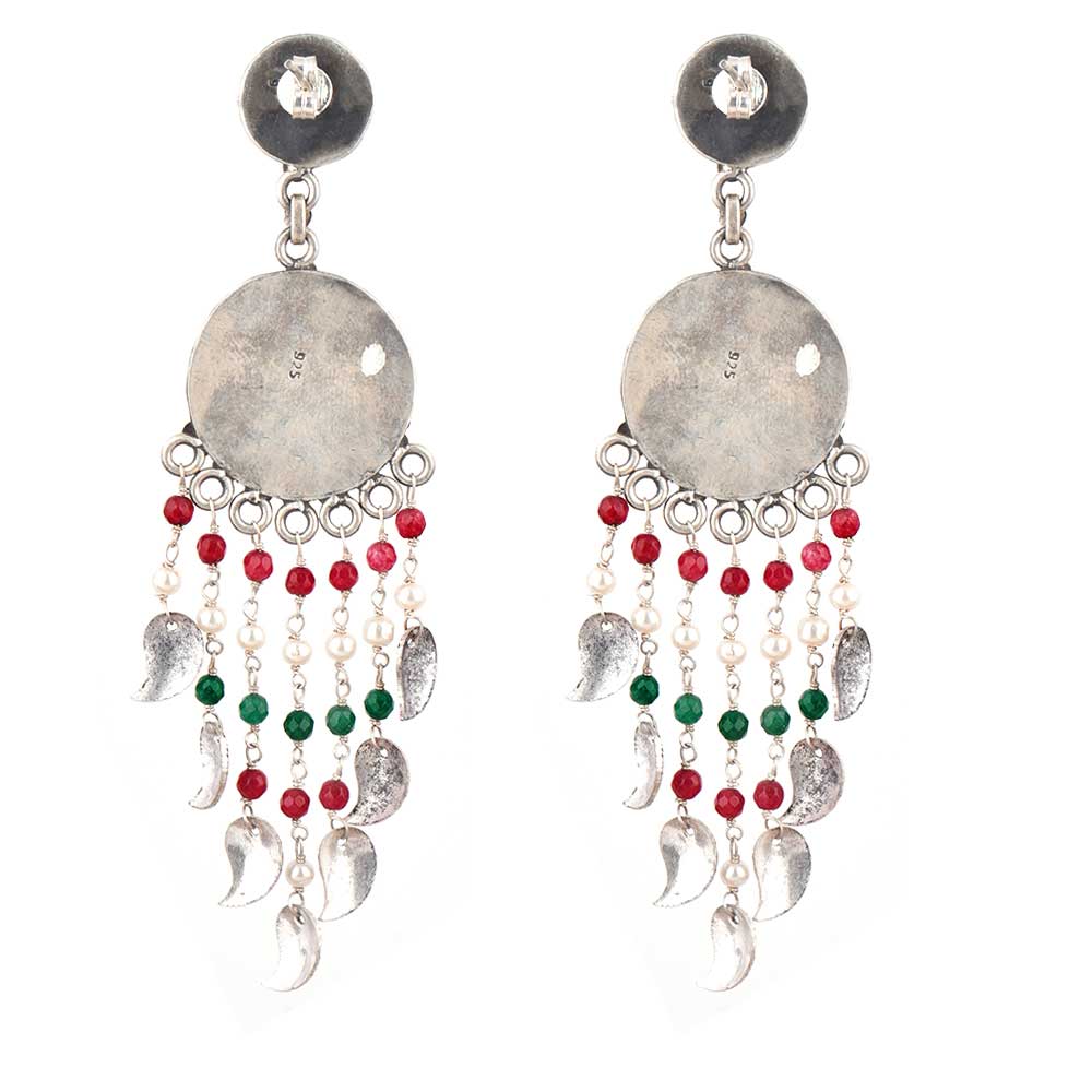 Hand crafted Dream catcher Design 92.25 Sterling silver Earrings Chandelier Oxidized pattern with long Tassels made of red chalcedony ,green peridot and pearl beads . It is the ideal choice for traditional Indian wedding, engagement party, reception, valentine day or other formal function. Wear it yourself or gift it to your near and ear ones.